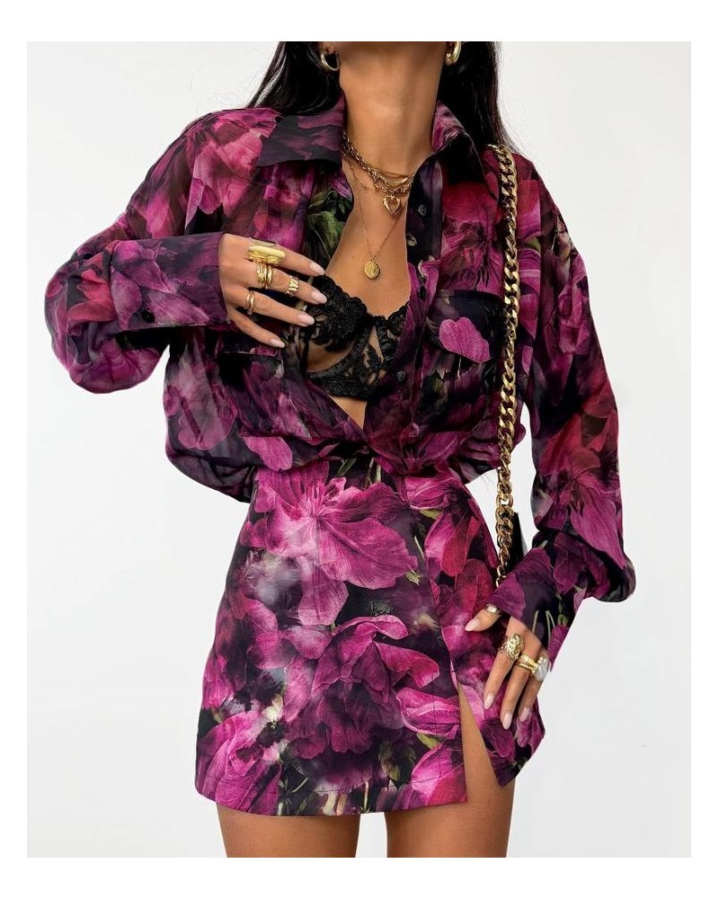 Koszula przyciąga wzrok wyrazistym, kwiatowym printem w głębokich odcieniach różu i fioletu. Klasyczny kołnierzyk i dłuższy tył dodają elegancji, a możliwość noszenia jej wpuszczonej w spodnie lub luźno – daje swobodę stylizacji