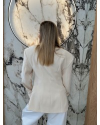 Stylowa marynarka damska z delikatnym marszczeniem w talii, które pięknie podkreśla sylwetkę. Wykonana z lekkiej tkaniny typu denim – idealna na sezon wiosna/lato. Doskonała do stylizacji codziennych i eleganckich.