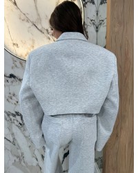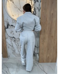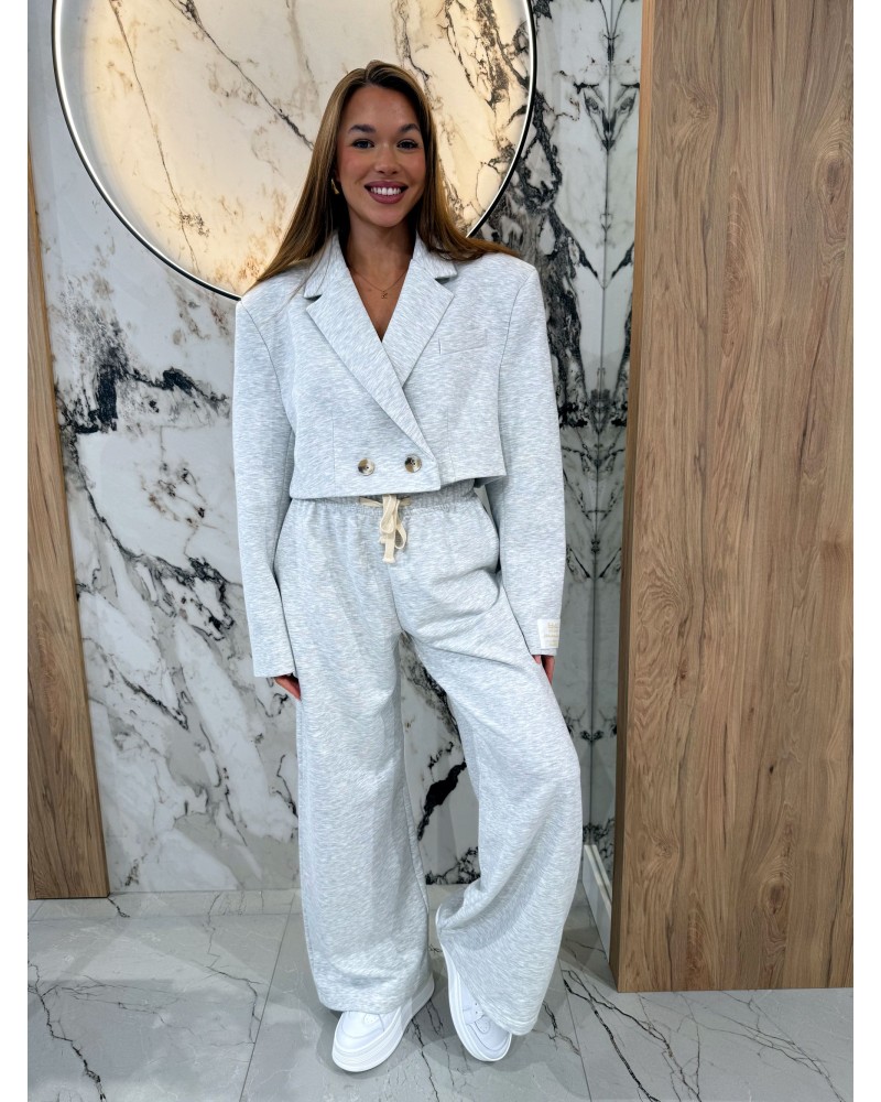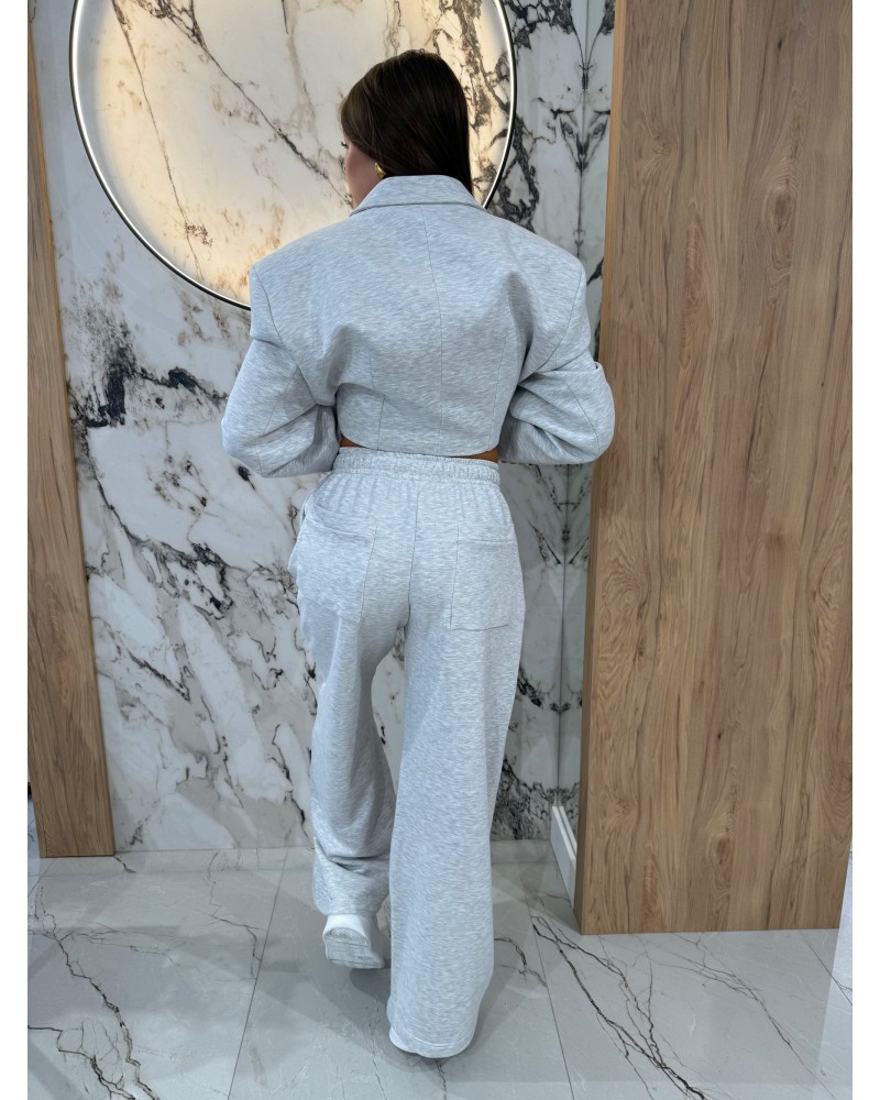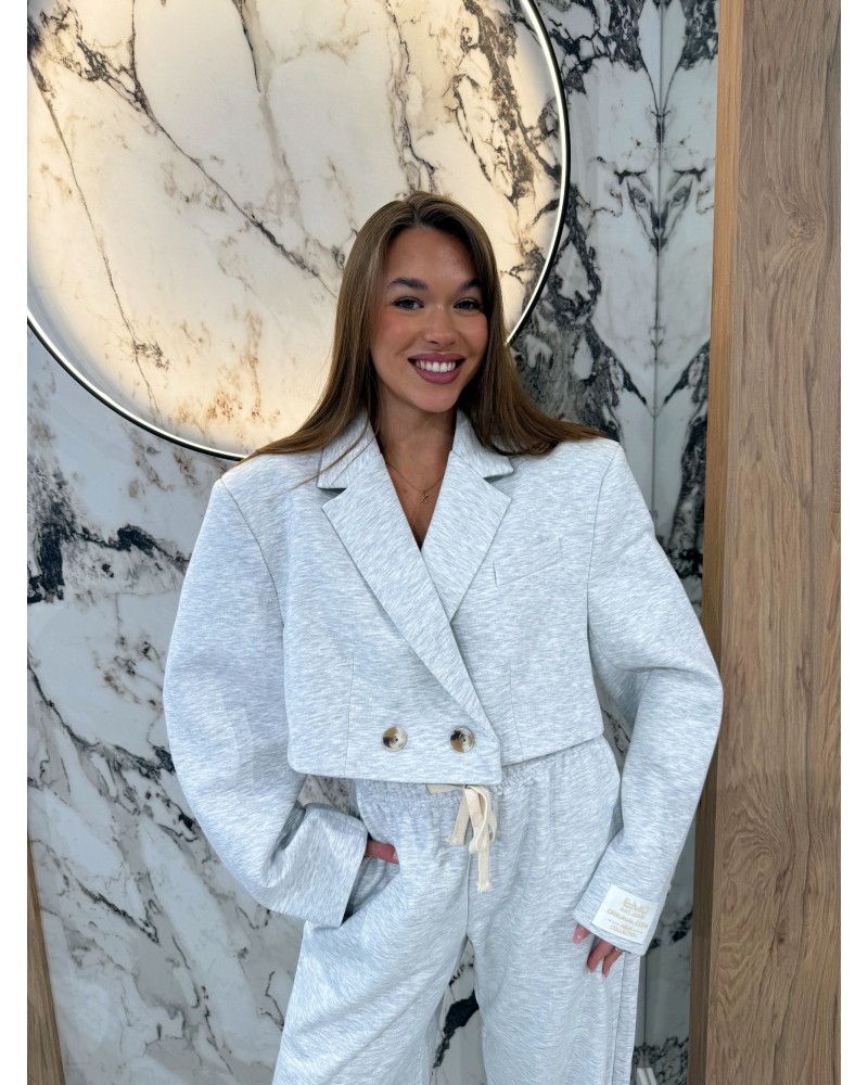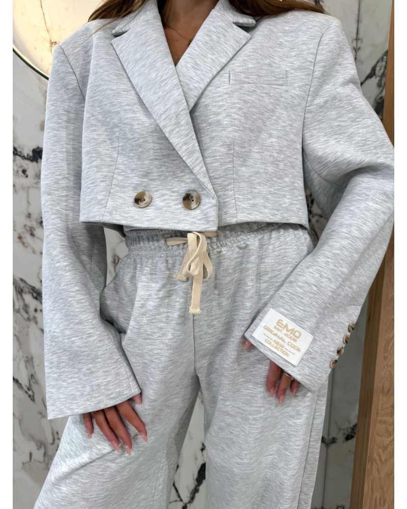 Komplet dresowy z marynarką EMO w kolorze szarym to idealne połączenie komfortu i elegancji. Składa się z krótkiej, luźnej marynarki z ozdobnymi guzikami oraz szerokich, wygodnych spodni na elastycznym pasie 🩶. Idealny na codzienne wyjścia, spotkania ze znajomymi czy nawet na bardziej casualowe spotkania biznesowe. Stylowy, ale swobodny krój pozwala tworzyć wiele modnych stylizacji – wystarczy dodać sneakersy lub ulubione botki!