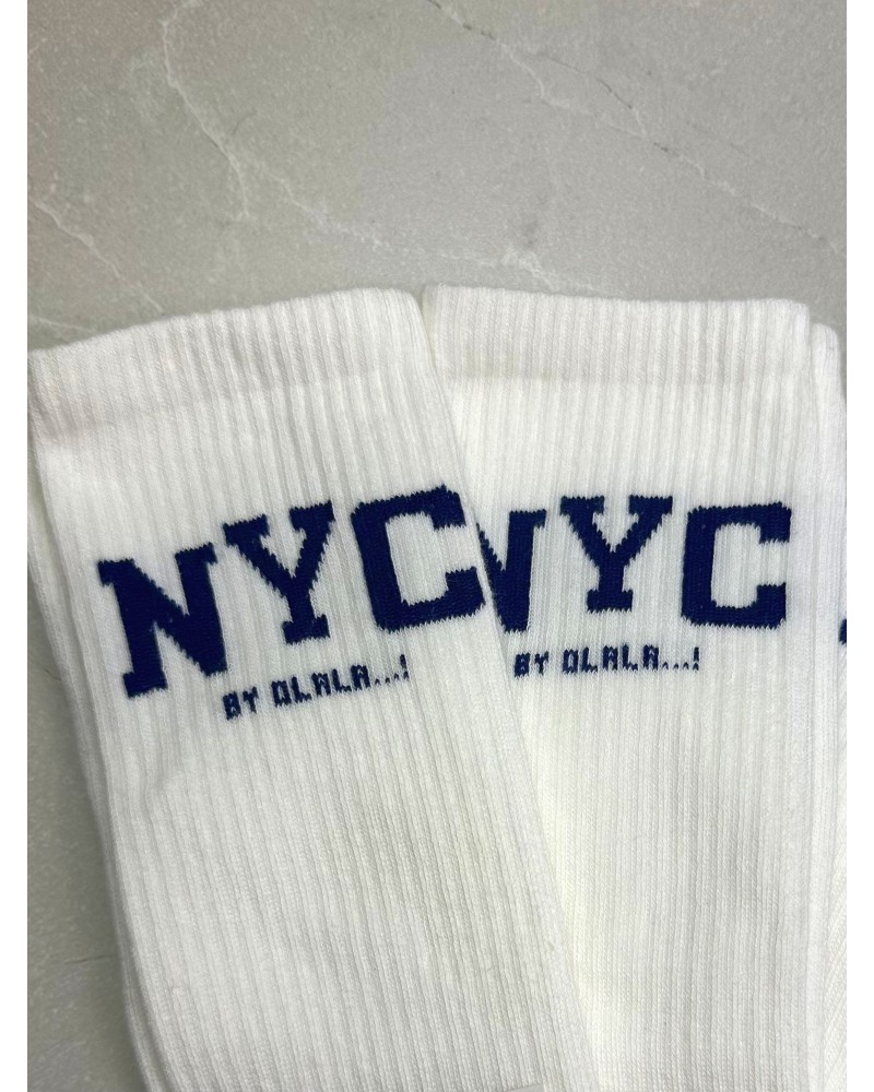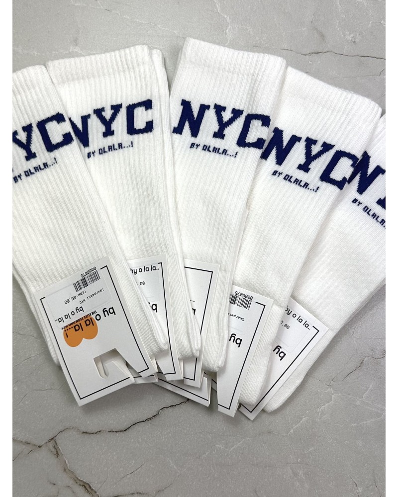 Skarpetki NYC By o la la...! z granatowym napisem 🗽 to must-have dla fanów miejskiego stylu. Wykonane z miękkiej, elastycznej bawełny, świetnie dopasowują się do stopy i zapewniają komfort przez cały dzień. Kontrastowy napis NYC nadaje im charakteru i sprawia, że idealnie pasują do sneakersów, jeansów i casualowych outfitów.