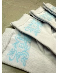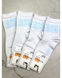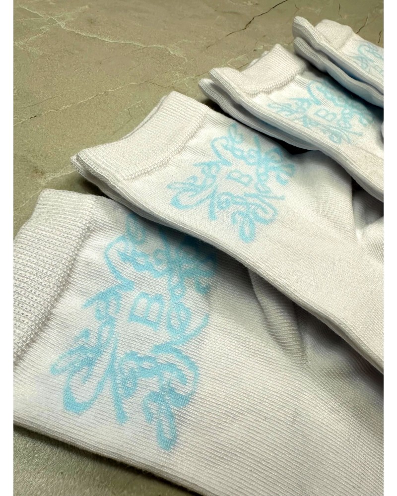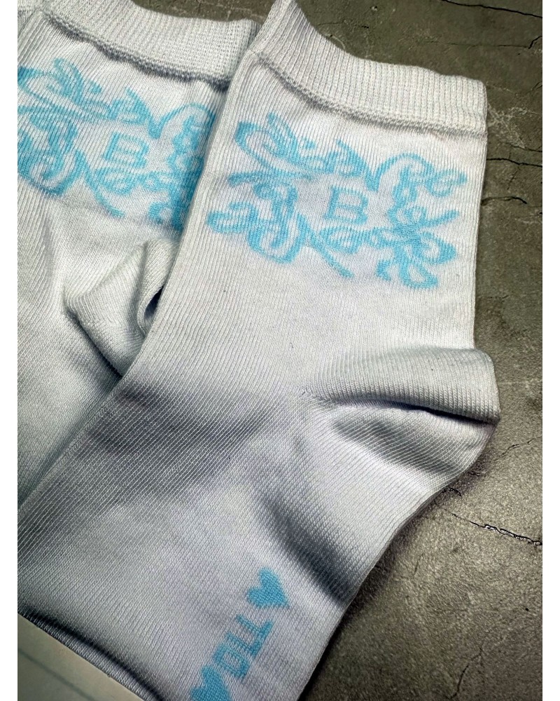 Białe skarpetki z jasnoniebieskim haftem B ❄️ – świeży akcent w Twojej stylizacji.