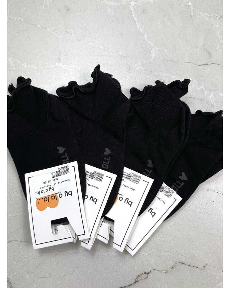 Czarne skarpetki z falbanką By o la la...! 🖤 to klasyka z modnym twistem. Wysokiej jakości materiał gwarantuje komfort noszenia, a efektowna falbanka dodaje lekkości nawet najprostszej stylizacji.