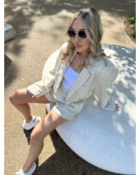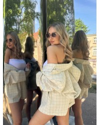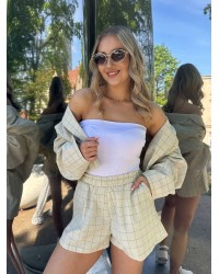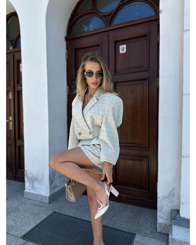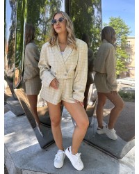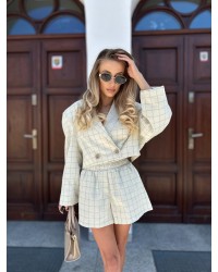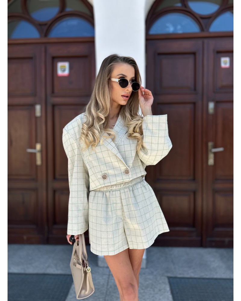 Wyjątkowy komplet garniturowy z subtelną kratką to idealna propozycja dla kobiet, które cenią sobie modę z klasą Marynarka o luźniejszym kroju z dwurzędowym zapięciem i krótkie szrty tworzą razem nowoczesny, a zarazem elegancki zestaw, który świetnie sprawdzi się na co dzień, do pracy, jak i na wyjście z przyjaciółmi
