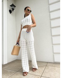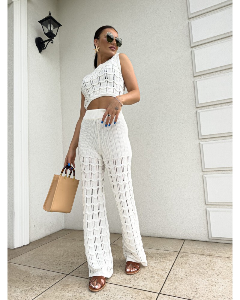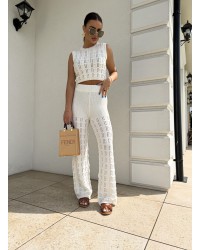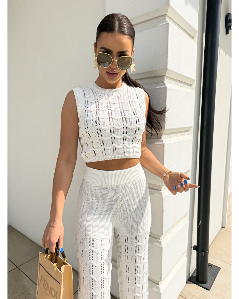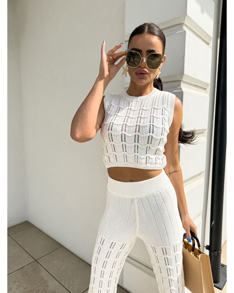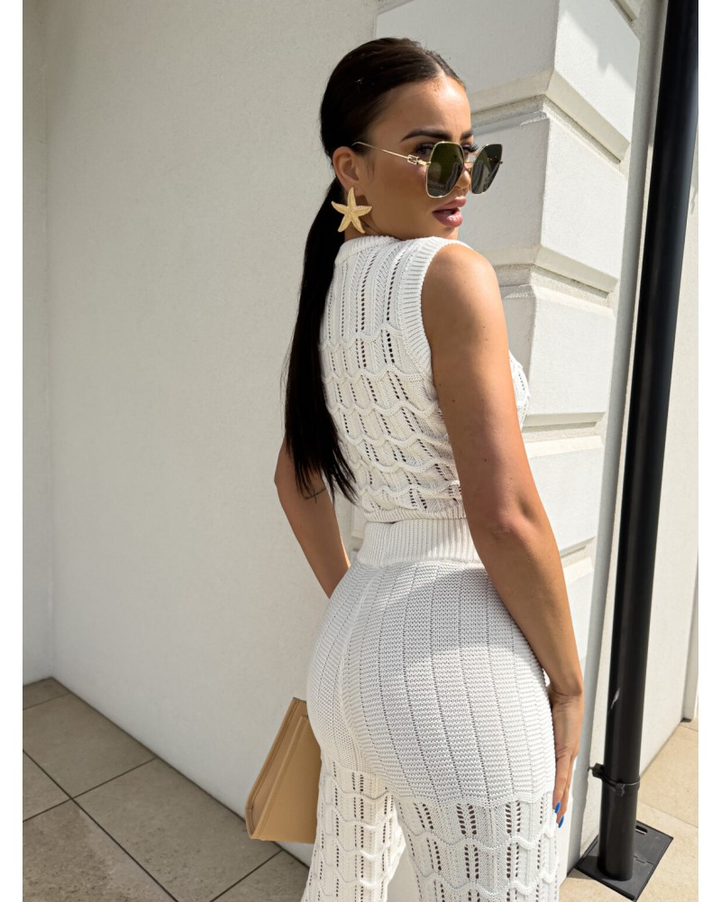 Ten stylowy dzianinowy komplet to must-have w garderobie każdej kobiety ceniącej komfort i modny wygląd Składa się z krótkiego topu bez rękawów oraz długich, luźnych spodni z elastycznym pasem – całość tworzy harmonijną i kobiecą stylizację, która sprawdzi się o każdej porze dnia