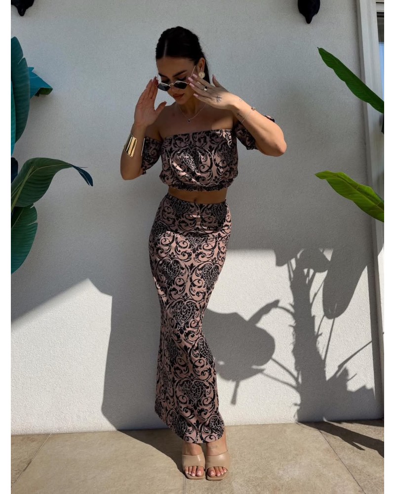 Ten wyjątkowy komplet damski to połączenie elegancji i zmysłowości. Bluzka z odkrytymi ramionami i efektownym dekoltem pięknie podkreśla sylwetkę, a dopasowana spódnica z wysokim stanem dodaje kobiecego uroku. Kwiatowy wzór sprawia, że stylizacja nabiera romantycznego i wyrazistego charakteru