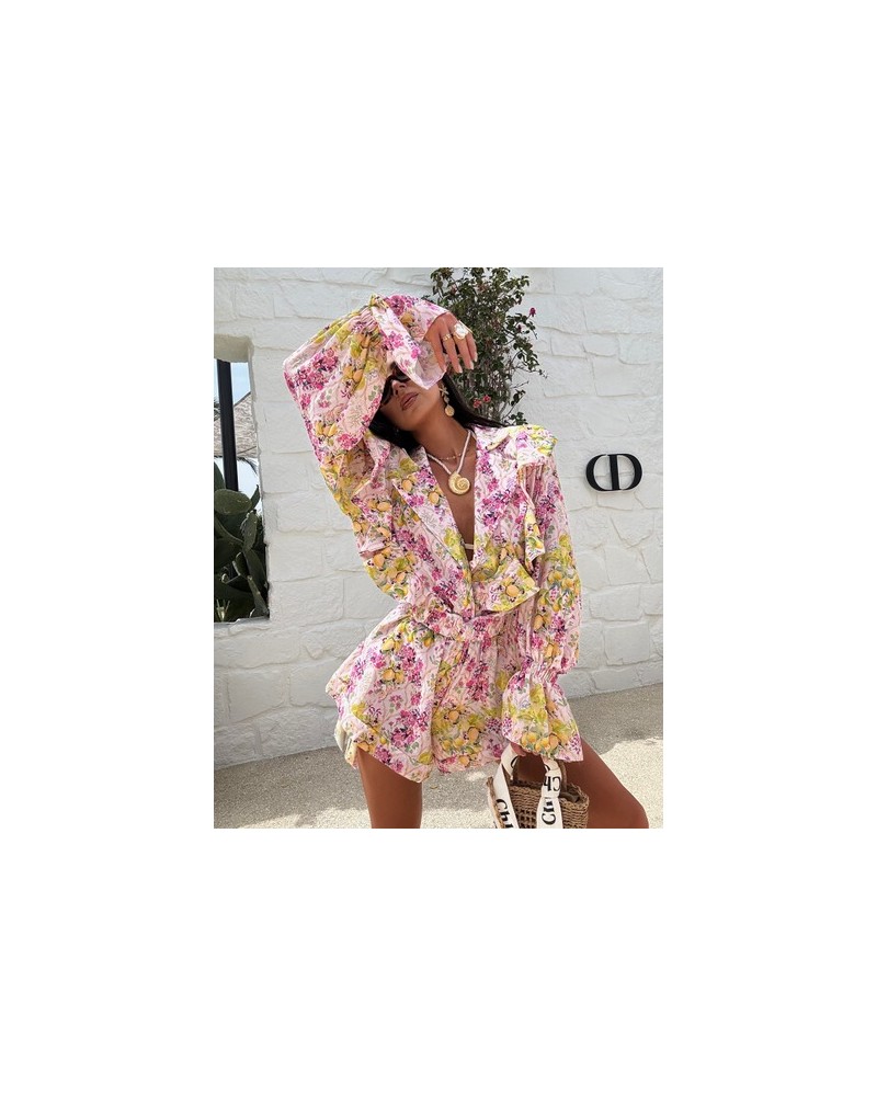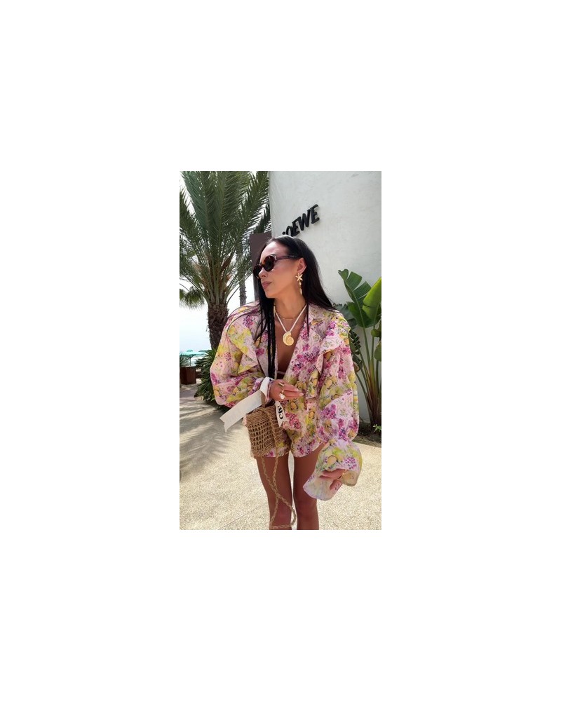Zestaw La Dolce Vita to kwintesencja letniego stylu i włoskiego klimatu Zwiewny komplet z delikatnym, romantycznym printem to połączenie komfortu i wyjątkowego designu. Góra z głębokim dekoltem i falbanami przy ramionach nadaje lekkości i kobiecego uroku, a elastyczne szorty z wyższym stanem pięknie podkreślają talię