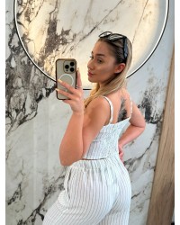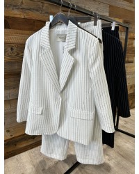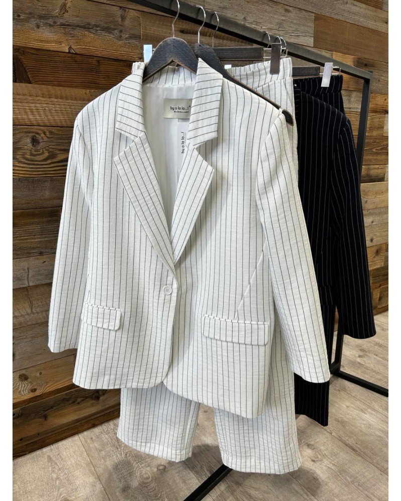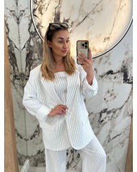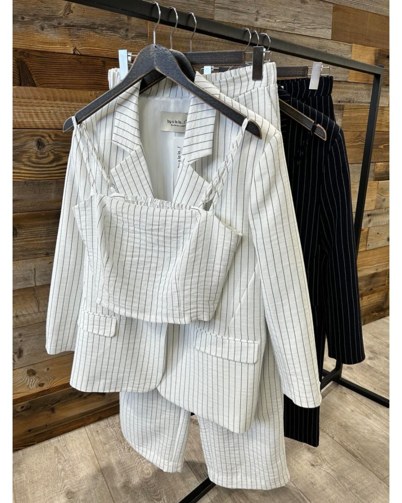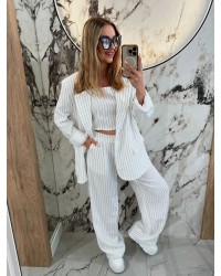 Styl, szyk i wygoda w jednym!  Ten trzyczęściowy komplet w klasyczne paski to idealne połączenie elegancji i miejskiego luzu. Składa się z dopasowanej marynarki, prostych spodni oraz kobiecego topu na ramiączkach – razem tworzą modną, spójną całość, którą możesz miksować na wiele sposobów.