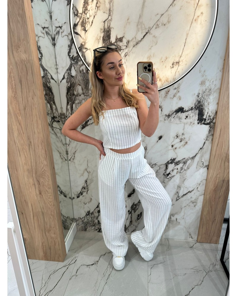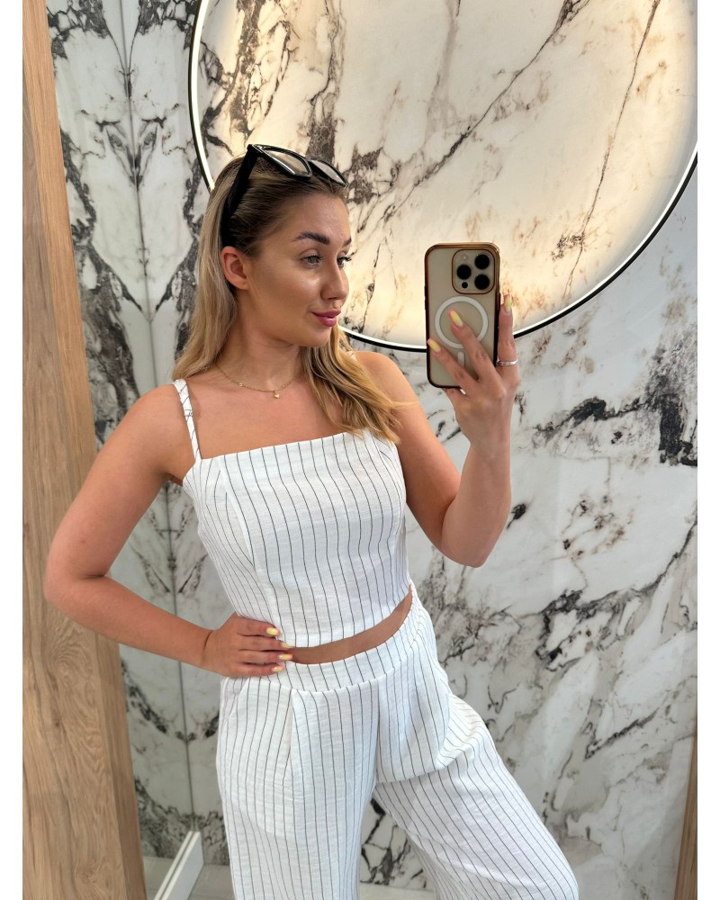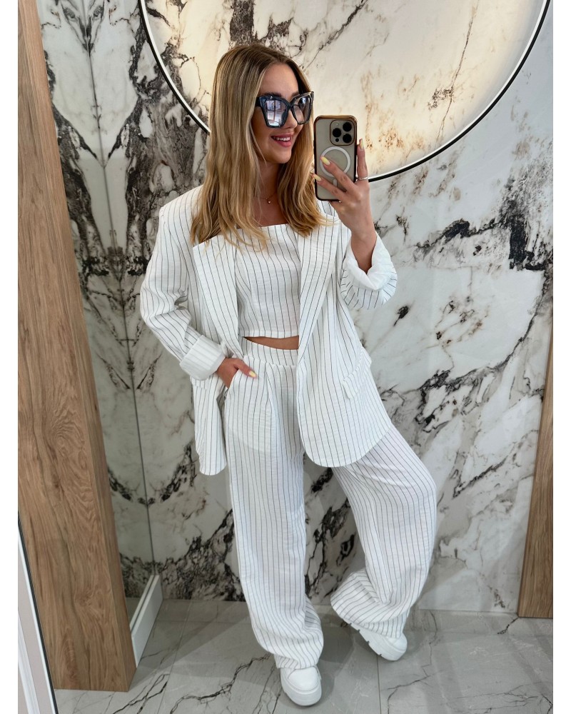 Elegancki komplet w paski – marynarka, spodnie i top  Styl biurowy w nowoczesnym wydaniu! Must-have na wiosnę i lato
