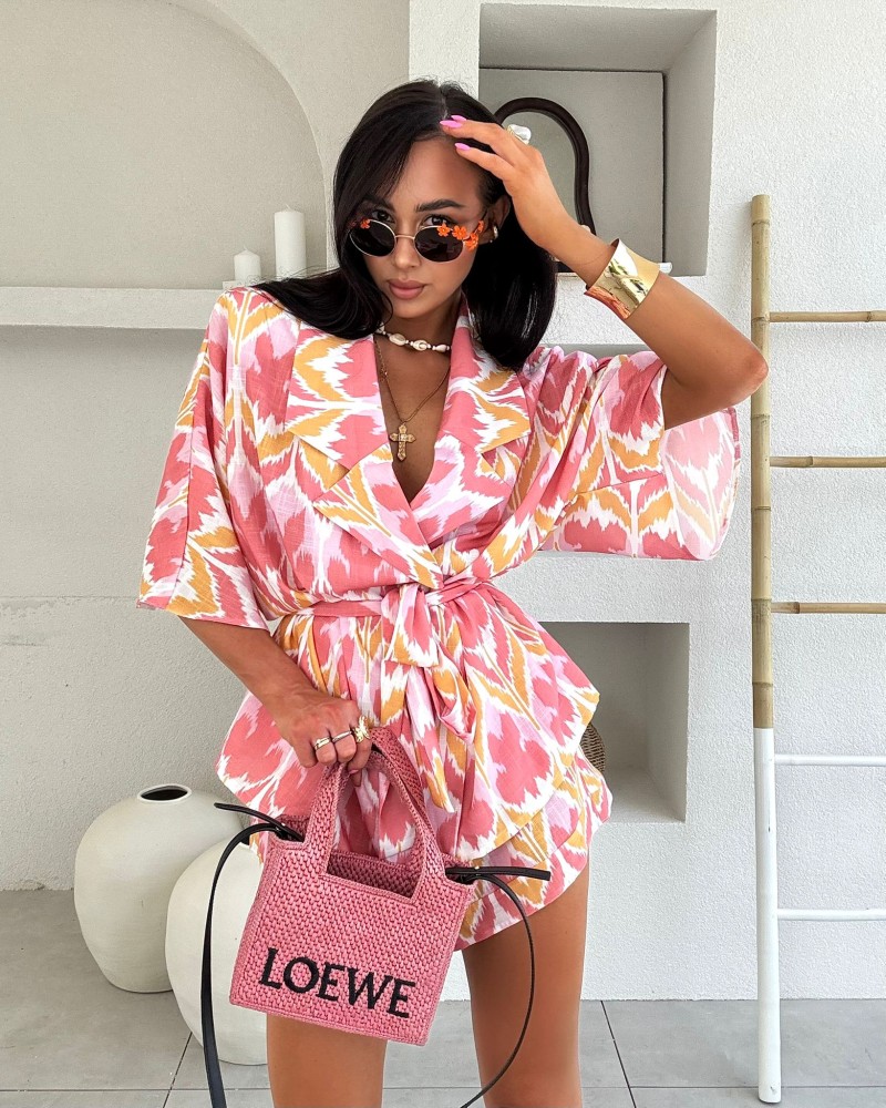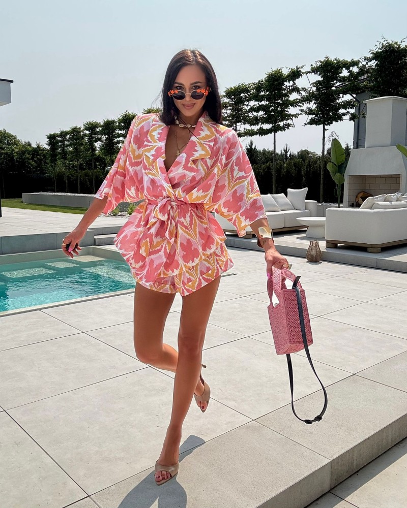 Luźny fason z krótkimi nogawkami oraz szerokimi rękawami gwarantuje swobodę ruchów i komfort w każdej sytuacji. Wiązanie w talii pięknie podkreśla sylwetkę, a głęboki dekolt nadaje całości zmysłowego charakteru.