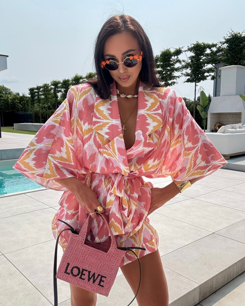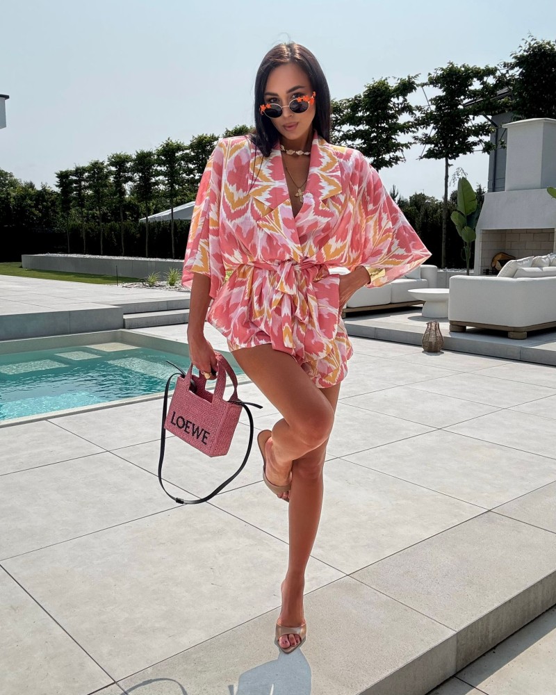 Ten kombinezon to absolutny hit letnich stylizacji! Połączenie wygody, kobiecego kroju i efektownego wzoru sprawia, że prezentuje się niezwykle stylowo i z klasą.