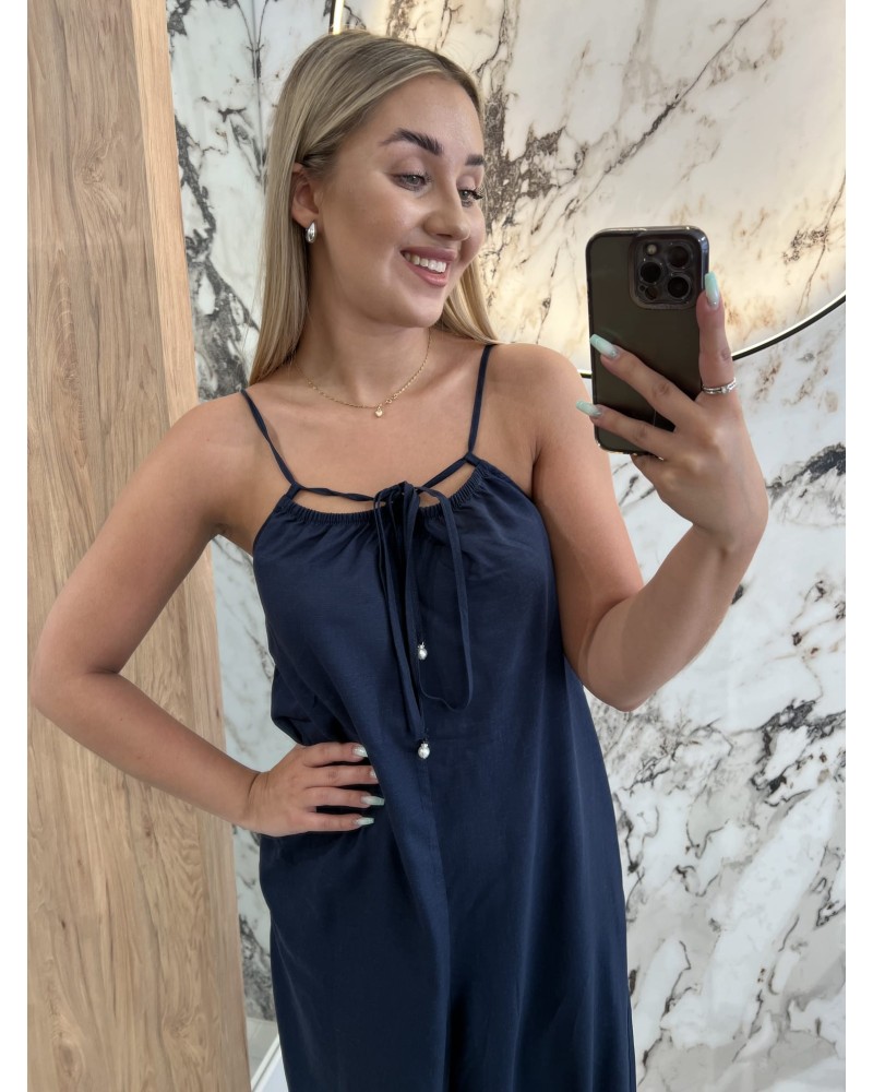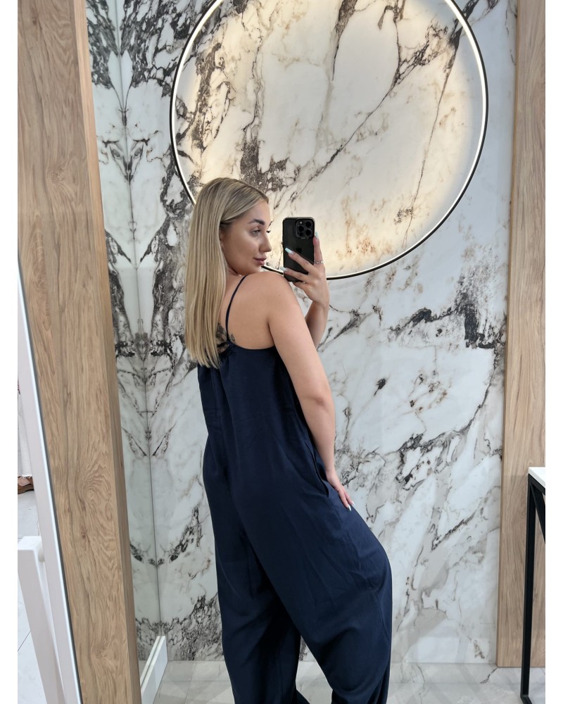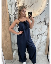 Ten kombinezon to esencja letniej elegancji i komfortu. Zwiewny, lekki materiał pięknie układa się na sylwetce, tworząc kobiecy i pełen klasy look. Cienkie ramiączka z efektownym wiązaniem na szyi dodają mu wyjątkowego charakteru, a delikatne marszczenie przy dekolcie subtelnie podkreśla linię biustu.