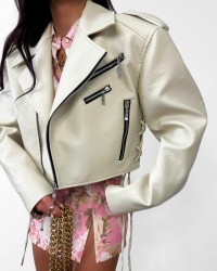 Kurtka jest wykonana z wysokiej jakości ekoskóry, co sprawia, że prezentuje się luksusowo i jednocześnie jest przyjazna dla środowiska . Dzięki swojej strukturze doskonale układa się na sylwetce, a jej uniwersalny kolor sprawia, że pasuje do wszystkiego.