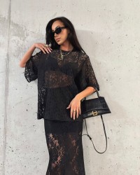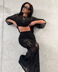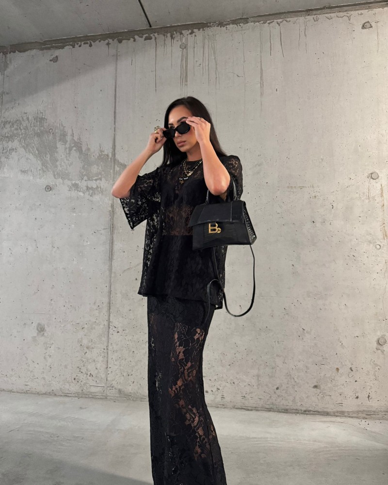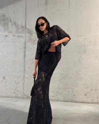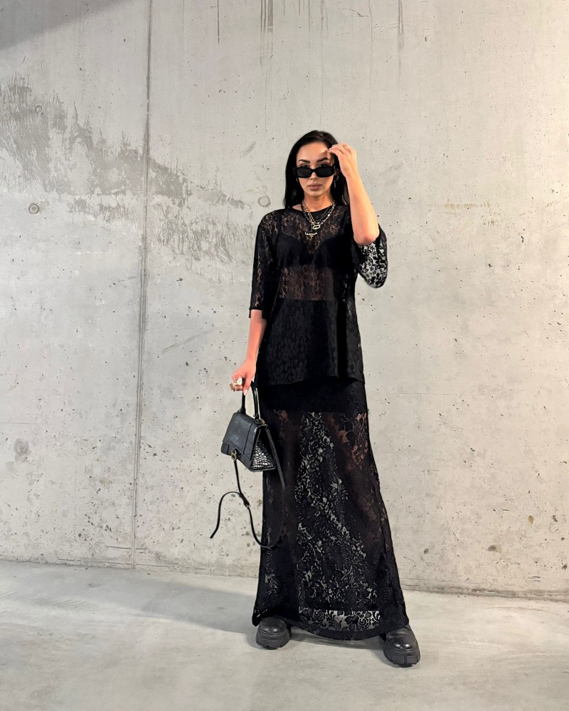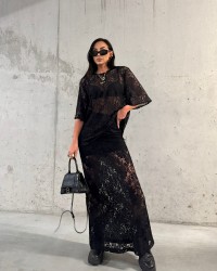 Elegancka długa koronkowa sukienka o luźnym kroju, idealna na wieczorne wyjścia. Przezroczysty materiał subtelnie eksponuje sylwetkę, łącząc zmysłowość z nowoczesnym stylem.