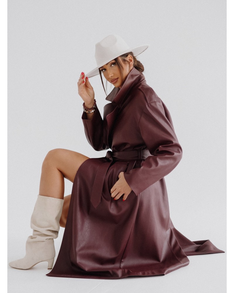 Stylowy trencz z ekoskóry o klasycznym kroju z paskiem w talii. Idealny wybór na sezon przejściowy, łączący elegancję z nowoczesnym akcentem.