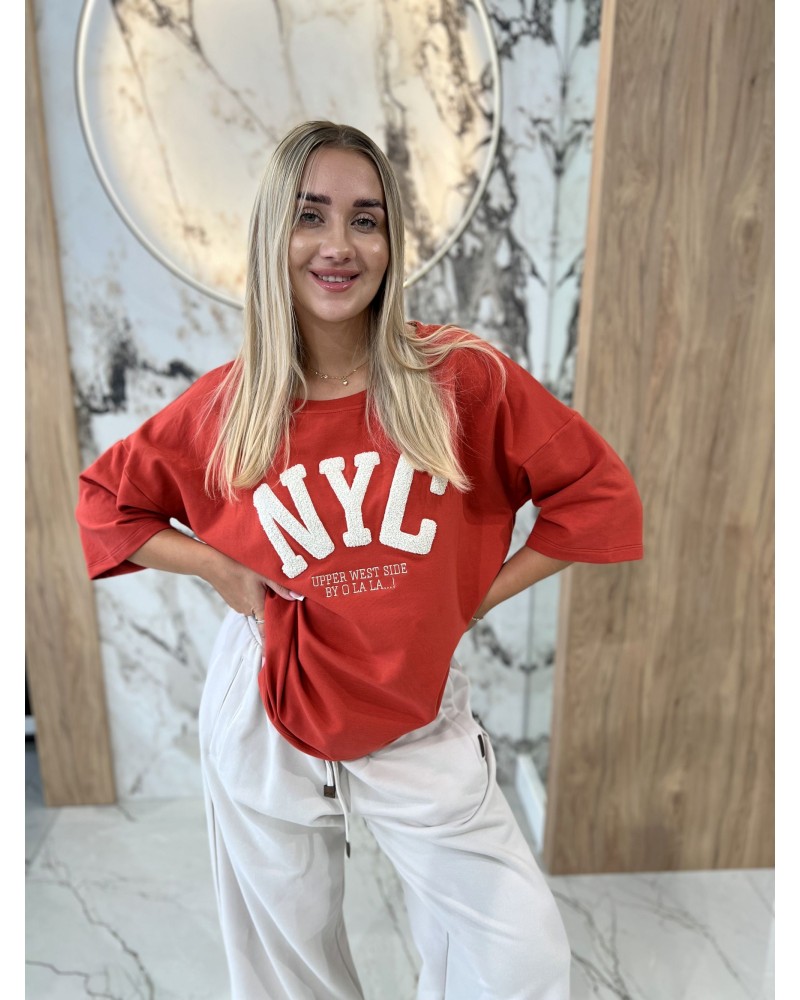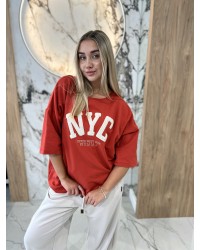 Luźny T-shirt z nadrukiem NYC i oversize’owym fasonem. Komfortowy i modny – idealny do stylizacji na co dzień.