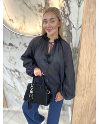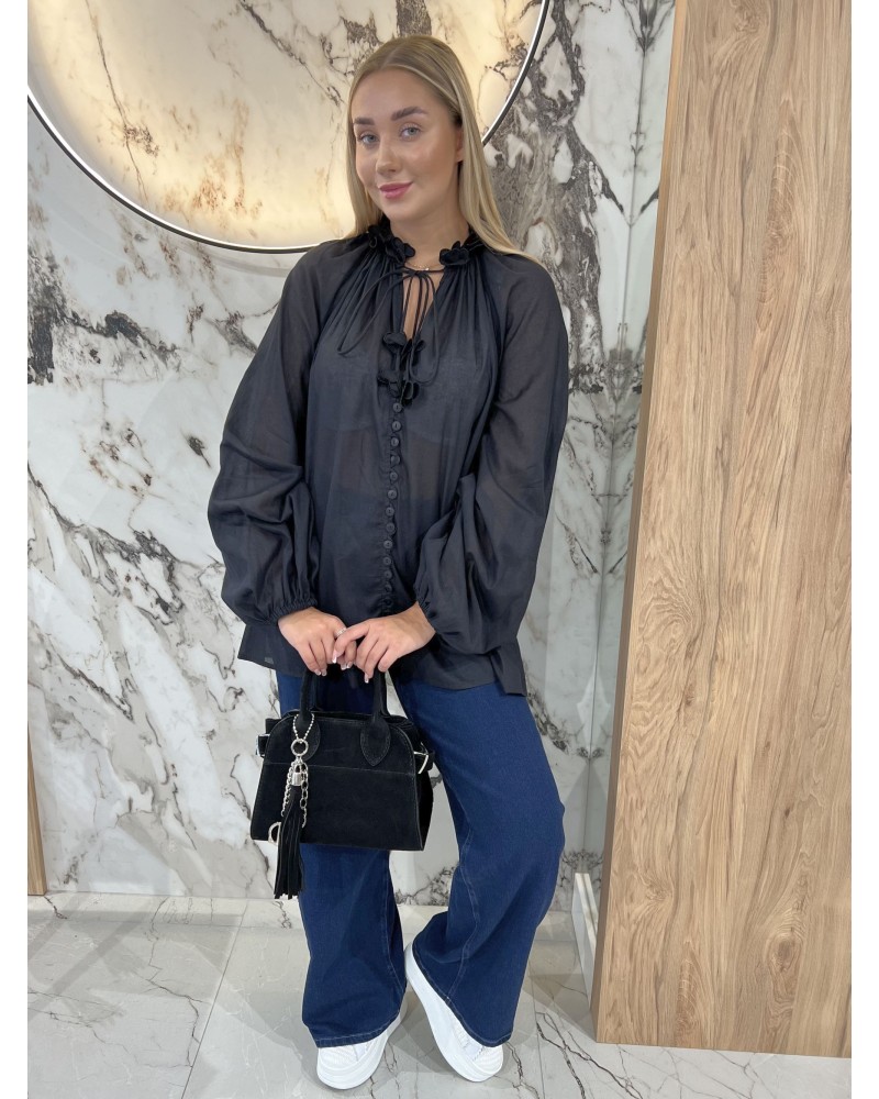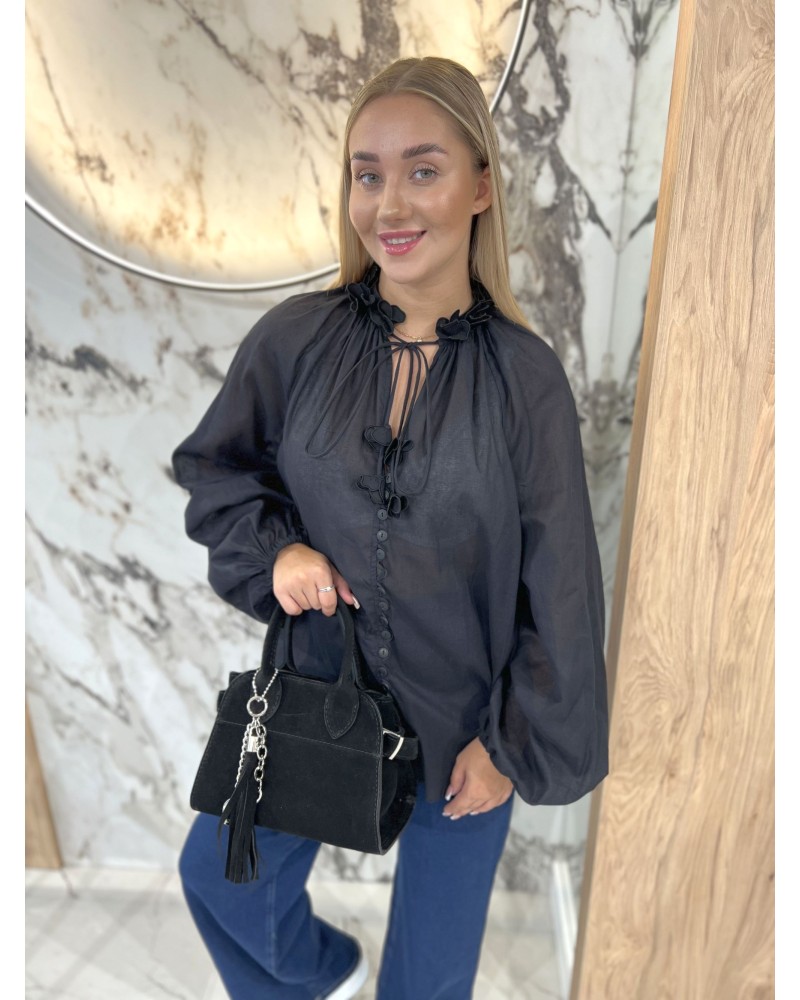 Subtelna bluzka o lekkim, zwiewnym kroju to doskonała propozycja dla kobiet, które cenią kobiecy i romantyczny styl. Model posiada delikatne wiązanie przy dekolcie oraz ozdobne aplikacje w formie kwiatów, które nadają całości wyjątkowego charakteru. Długie rękawy zakończone gumką zapewniają wygodę i lekko bufowany efekt. Luźny fason świetnie układa się na sylwetce i pasuje do wielu okazji — zarówno do pracy, jak i na wieczorne wyjście. Bluzka doskonale komponuje się z klasycznymi spodniami, spódnicą czy jeansami, tworząc elegancki, a zarazem swobodny look.
