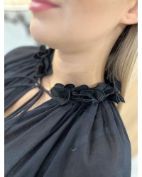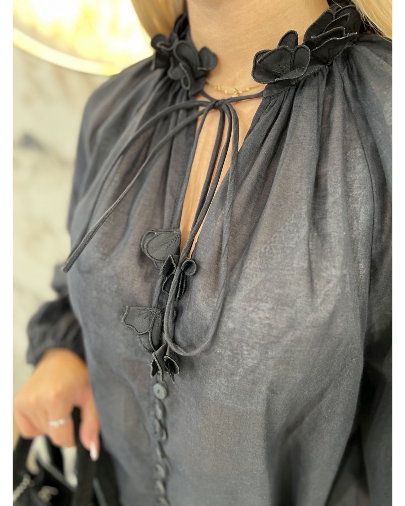 Zwiewna bluzka z ozdobnym wiązaniem przy dekolcie i aplikacjami w formie kwiatów. Idealna na eleganckie i codzienne stylizacje.