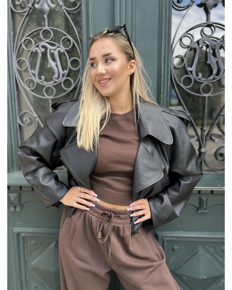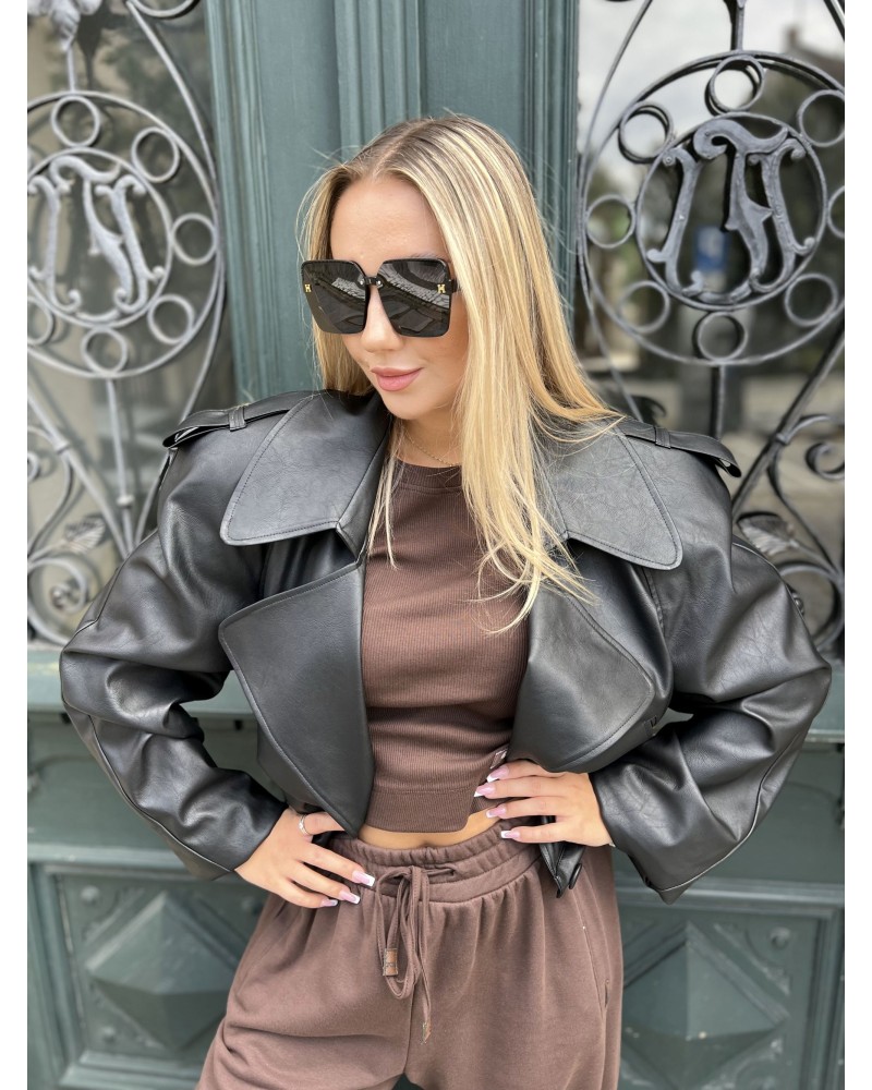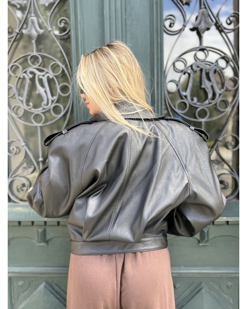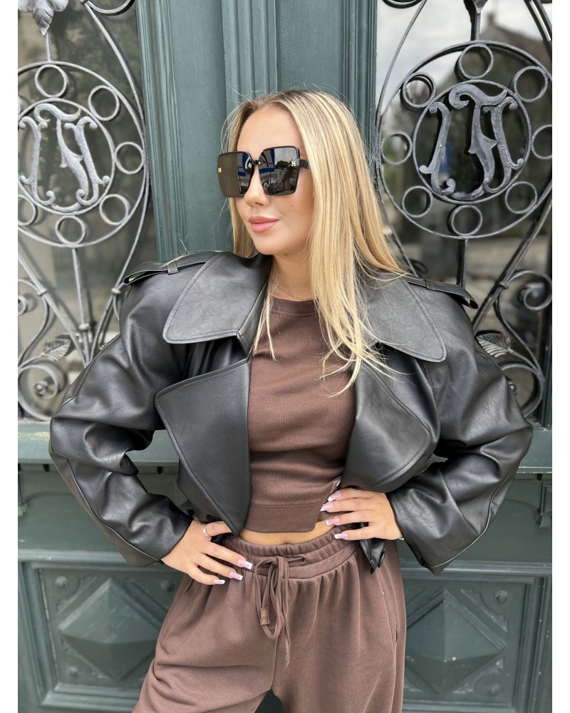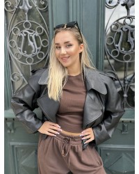 Kurtka z ekoskóry o krótkim kroju z klapami i ozdobnymi naramiennikami. Idealna do miejskich i casualowych stylizacji.