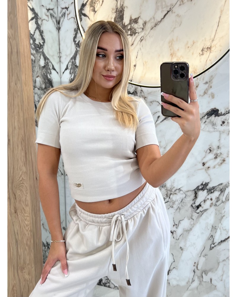 Krótki, prążkowany top z elastycznego materiału, ozdobiony subtelną naszywką w kształcie serduszka. Idealny do codziennych i sportowych stylizacji.