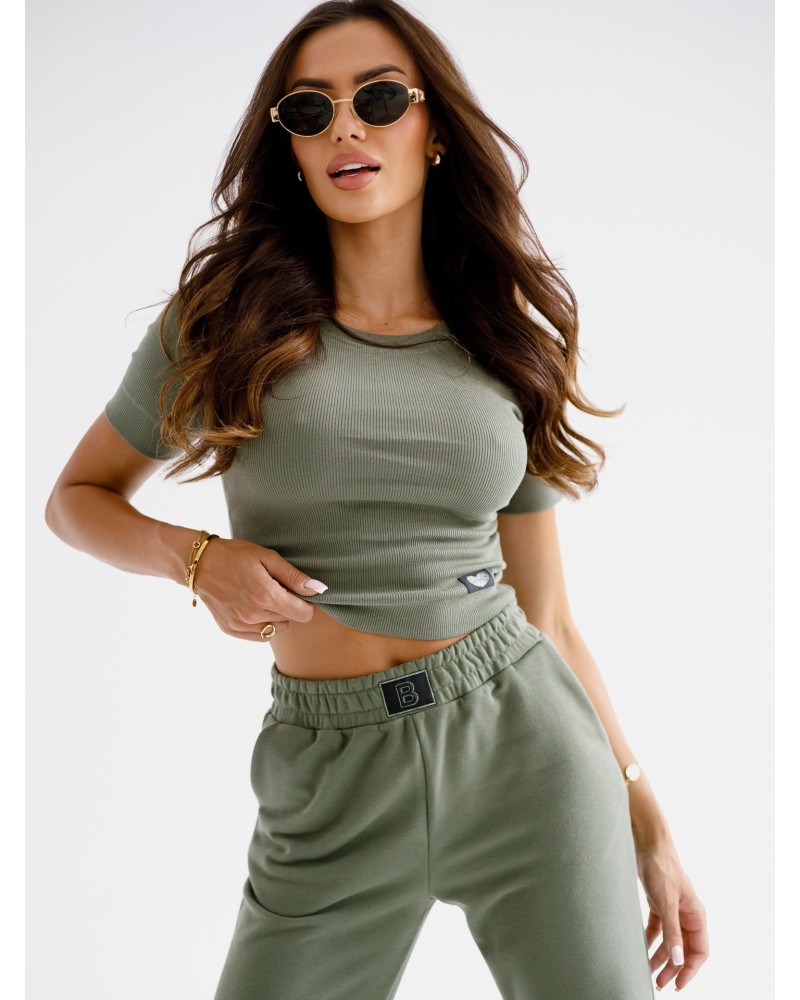 Krótki, prążkowany top z elastycznego materiału, ozdobiony subtelną naszywką w kształcie serduszka. Idealny do codziennych i sportowych stylizacji.