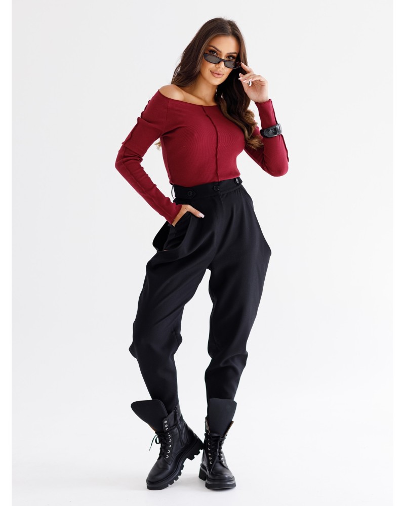 Stylowa i wygodna bluzka wykonana z elastycznego, prążkowanego materiału to idealna propozycja dla osób ceniących nowoczesne i minimalistyczne fasony. Model z długim rękawem zapewnia komfort noszenia o każdej porze roku, a surowe wykończenie przy dekolcie, rękawach i dole dodaje jej modowego charakteru. Świetnie dopasowuje się do sylwetki, podkreślając jej kształty. Uniwersalny fason sprawia, że bluzka doskonale komponuje się zarówno ze spodniami, jak i spódnicami. To must-have w każdej garderobie.