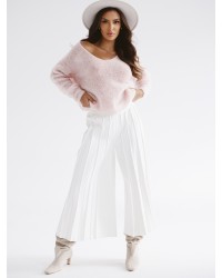 Ten puszysty sweter to połączenie przytulnego komfortu z kobiecym stylem. Wykonany z niezwykle miękkiego, delikatnego materiału, który przyjemnie otula ciało i zapewnia ciepło w chłodniejsze dni. Głęboki dekolt w serek pięknie eksponuje szyję i sprawia, że sweter doskonale sprawdzi się zarówno w codziennych, jak i bardziej eleganckich stylizacjach. Luźniejszy krój oraz długie rękawy zapewniają wygodę i swobodę ruchów. To doskonały wybór na jesień i zimę – niezastąpiony element kobiecej garderoby.