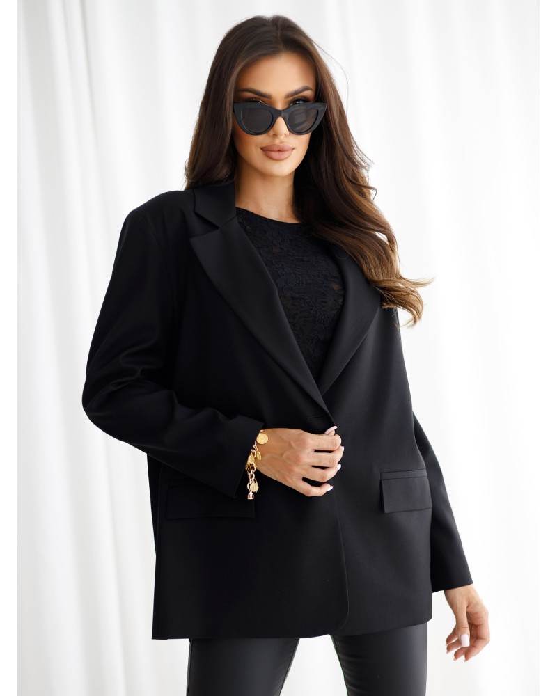 Klasyczna marynarka damska z zapięciem na guzik i kieszeniami z patkami. Idealna do eleganckich i codziennych stylizacji.