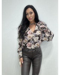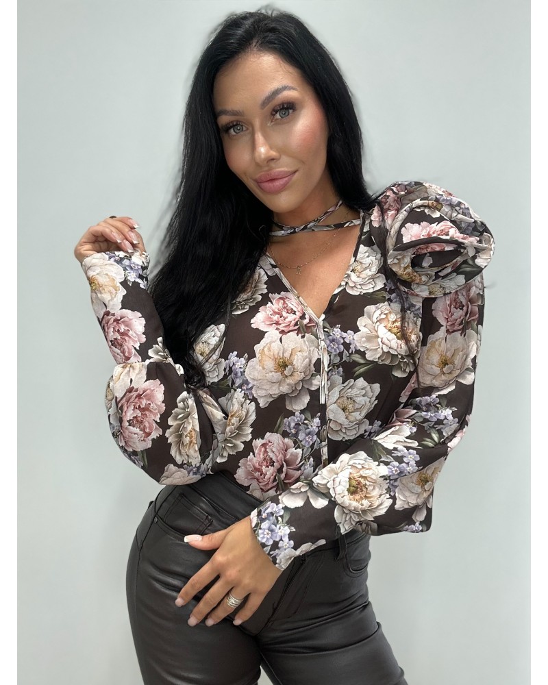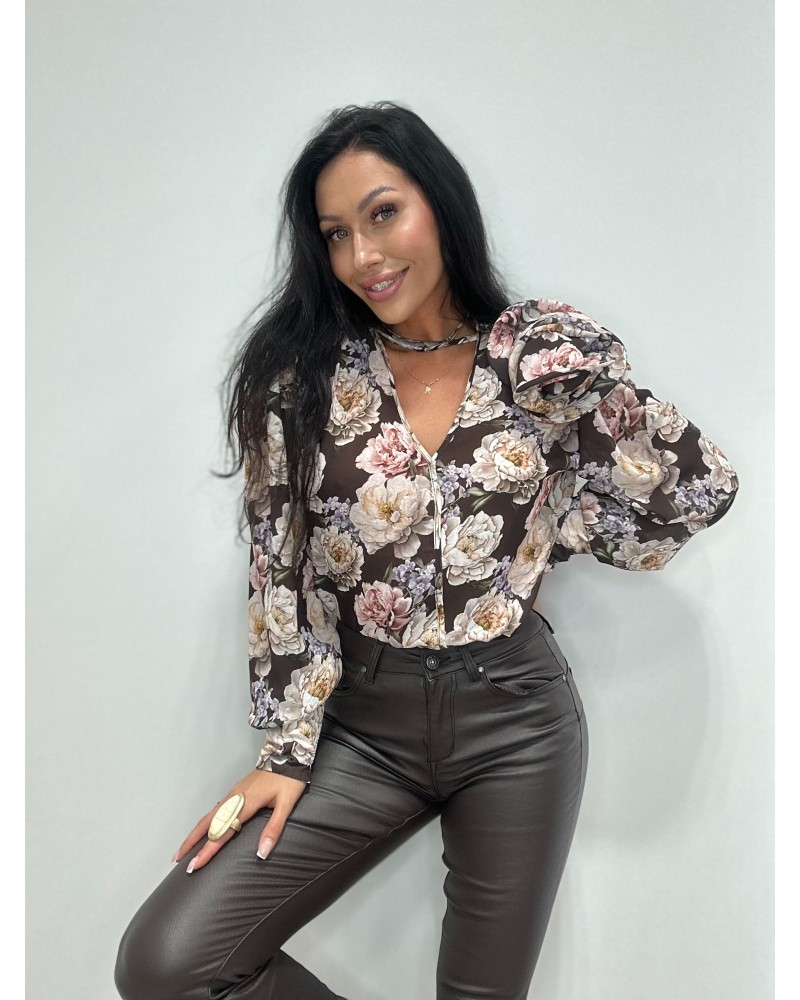 Stylowa bluzka o kobiecym kroju, ozdobiona wyrazistym, kwiatowym printem, który nadaje jej romantycznego i eleganckiego charakteru. Wykonana z lekkiego, przewiewnego materiału, zapewnia komfort noszenia przez cały dzień. Rozkloszowane rękawy z falującym wykończeniem przyciągają wzrok i dodają lekkości, a wiązanie przy dekolcie umożliwia dopasowanie głębokości wycięcia do własnych preferencji. Luźny fason sprawia, że bluzka doskonale prezentuje się zarówno w zestawach eleganckich, jak i casualowych. Idealna na przyjęcia, spotkania towarzyskie czy romantyczne wyjścia.