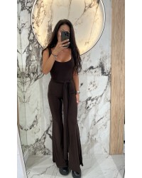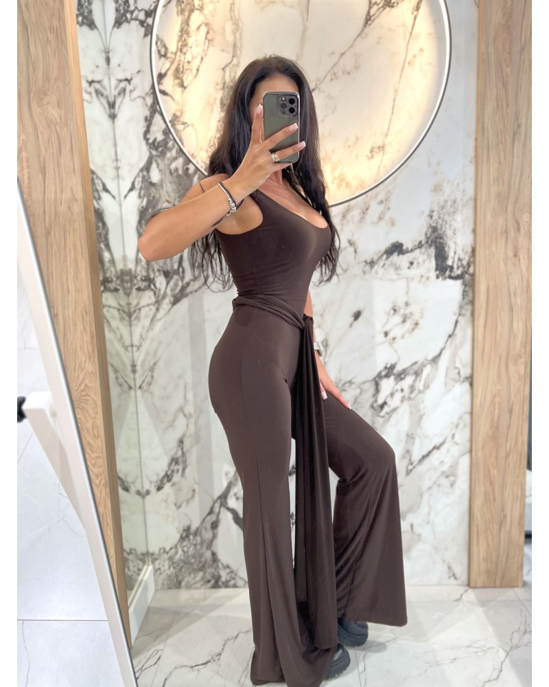 Stylowy kombinezon o kobiecym kroju,  Model wyróżnia się głębokim dekoltem oraz paskiem do wiązania w talii, dzięki czemu pięknie podkreśla sylwetkę i nadaje jej proporcji. Wykonany z lekkiego, przewiewnego materiału, zapewnia komfort noszenia w cieplejsze dni. Idealny wybór na wakacyjne wyjazdy, letnie imprezy czy spotkania, podczas których chcesz wyglądać modnie i wyjątkowo.