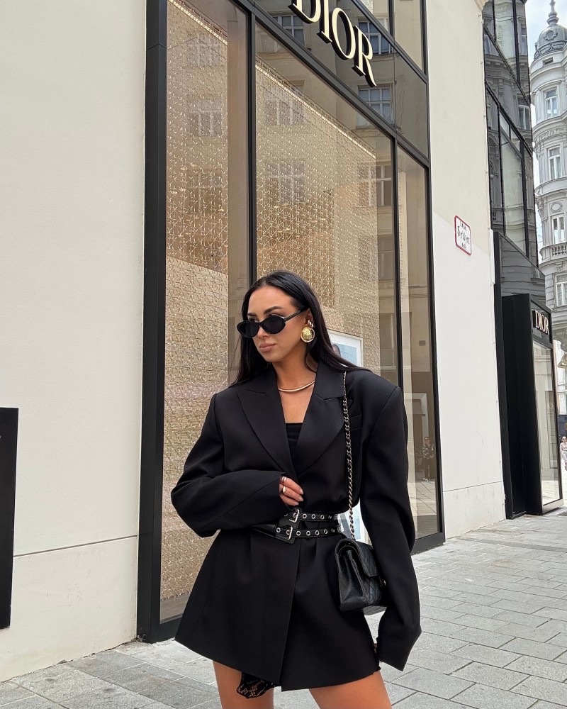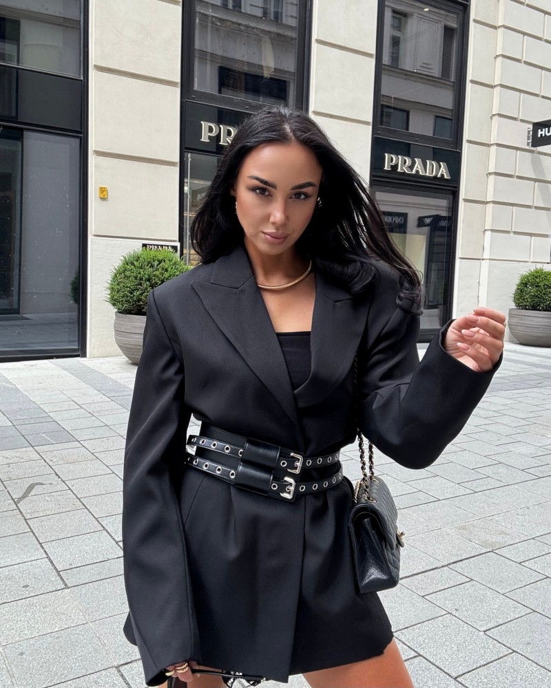 Elegancka marynarka o ponadczasowym kroju, wzbogacona szerokim paskiem podkreślającym talię. Idealna na spotkania biznesowe, wieczorne wyjścia czy stylizacje typu smart casual.
