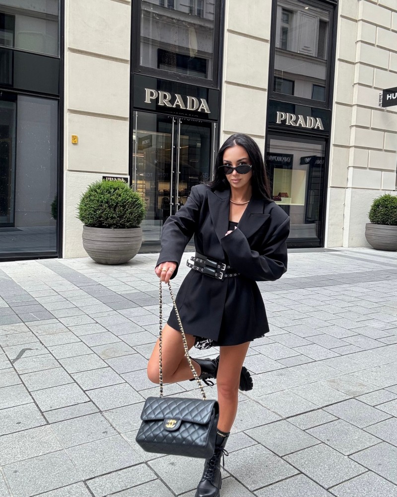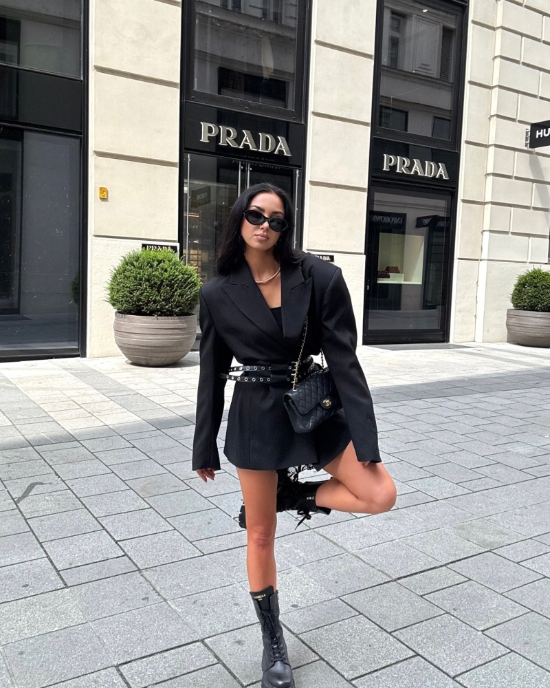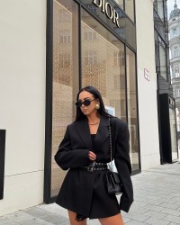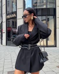 Stylowa marynarka o dopasowanym kroju, która łączy w sobie klasyczną elegancję z nowoczesnym charakterem. Wysokiej jakości tkanina zapewnia komfort noszenia oraz doskonałe układanie się materiału na sylwetce. Wyrazistym elementem jest szeroki pasek z metalową klamrą, który podkreśla talię i nadaje całości wyrazistego charakteru. Uniwersalny design pozwala tworzyć wiele różnorodnych stylizacji – od formalnych zestawów biurowych po kobiece outfity na wieczór. To idealny wybór dla osób ceniących modę premium, ponadczasowy styl oraz perfekcyjne wykończenie detali.