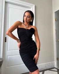 Elegancka sukienka typu tuba z ozdobnym marszczeniem z przodu i z tyłu, podkreślającym sylwetkę. Na biuście uwagę przyciąga efektowna, materiałowa róża, dodająca całości romantycznego i wyjątkowego charakteru.