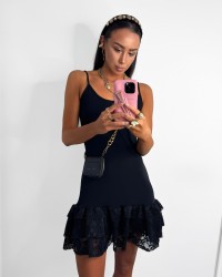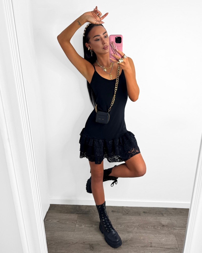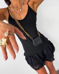 Sukienka mini na ramiączkach z koronkowym wykończeniem, łącząca subtelność z kobiecym charakterem. Idealna na wieczorne wyjścia i wyjątkowe okazje.
