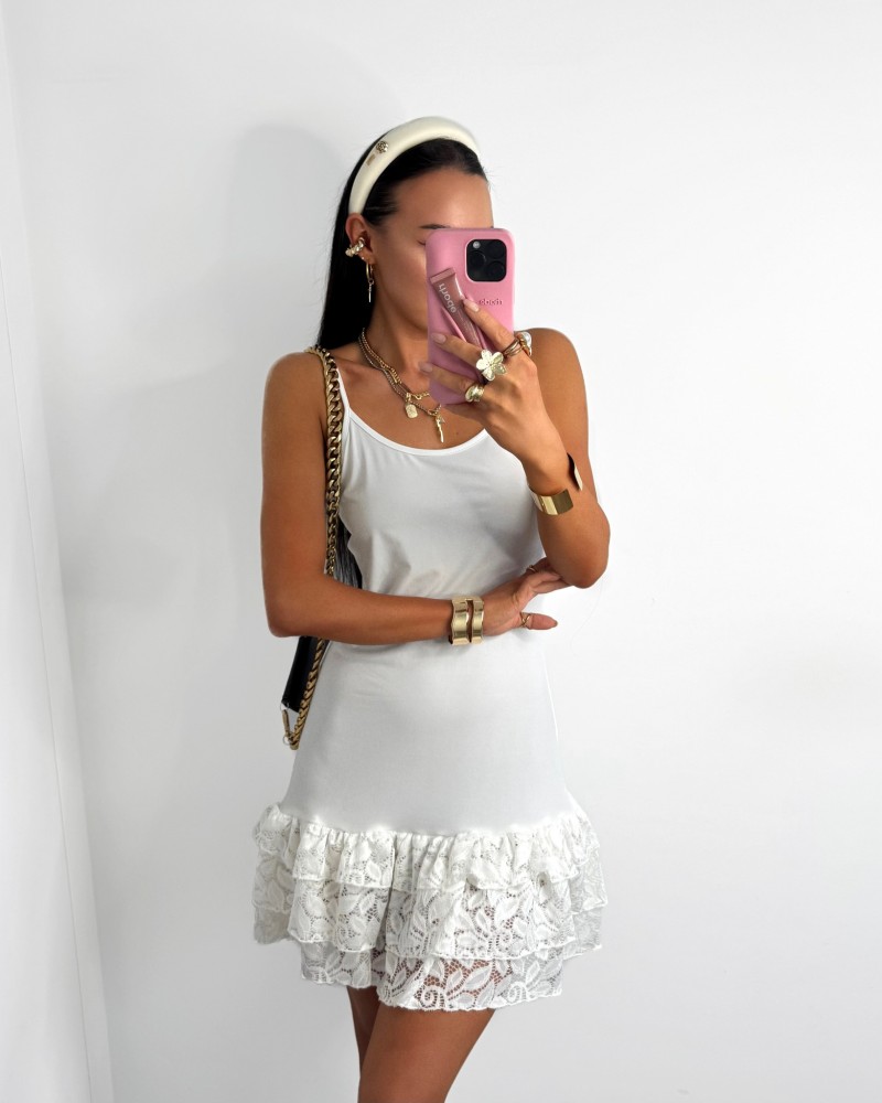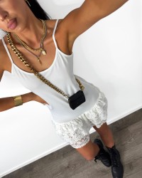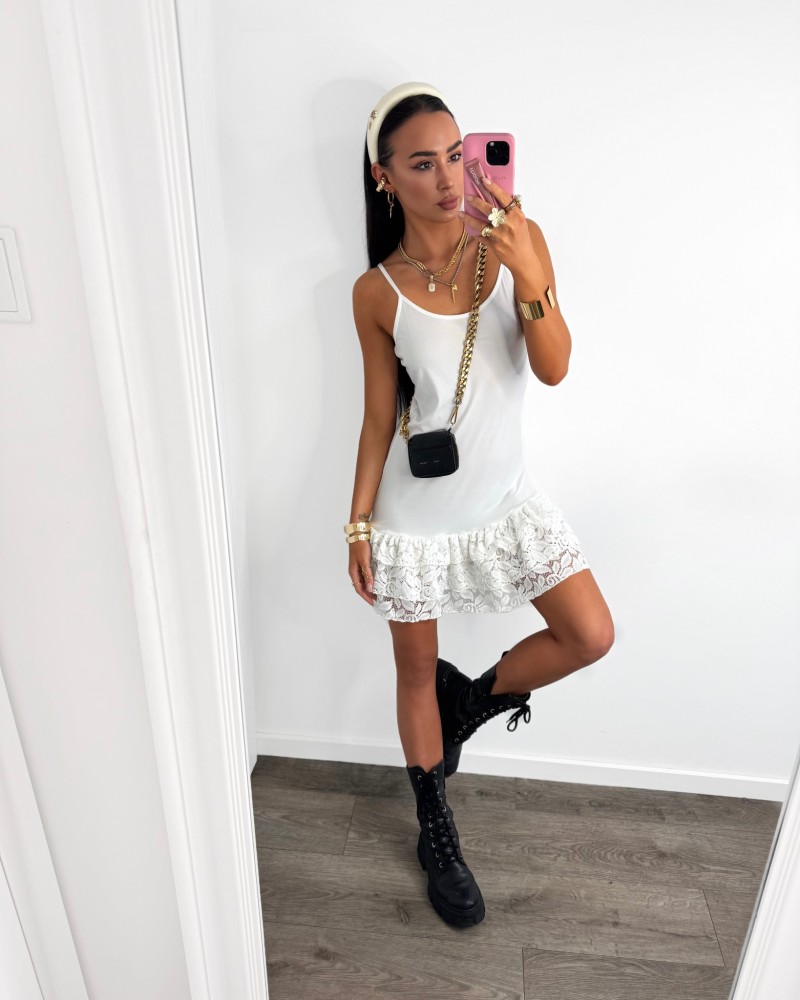 Sukienka mini na ramiączkach z koronkowym wykończeniem, łącząca subtelność z kobiecym charakterem. Idealna na wieczorne wyjścia i wyjątkowe okazje.