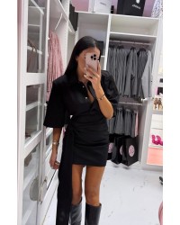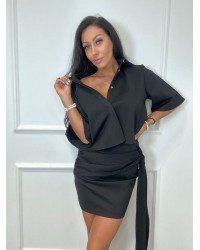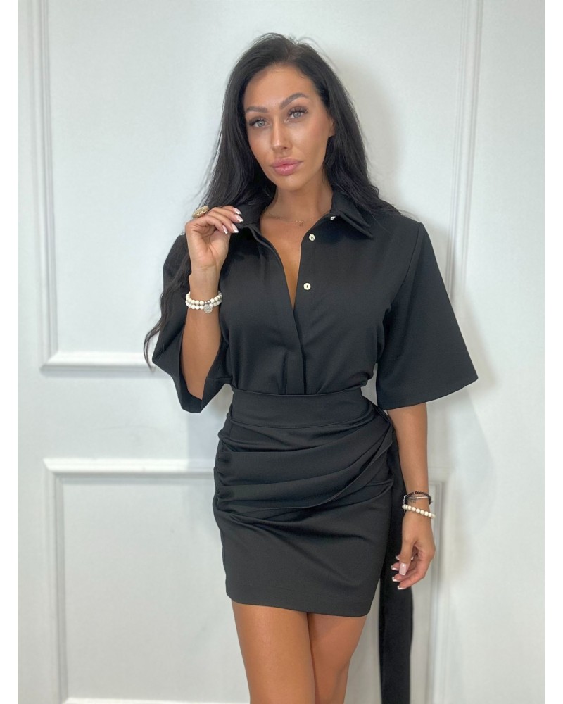 Ten wyjątkowy komplet to połączenie elegancji z nowoczesnym charakterem. Góra o koszulowym kroju z klasycznym kołnierzykiem i zapięciem na guziki prezentuje się szykownie i stylowo. Dopasowana spódnica z efektownym wiązaniem w talii pięknie podkreśla sylwetkę, dodając całości wyrazu. Cały zestaw tworzy spójną, modną stylizację, która sprawdzi się zarówno na wieczorne wyjścia, spotkania biznesowe, jak i specjalne okazje. Uniwersalny fason i ponadczasowy design sprawiają, że komplet będzie doskonałą bazą do wielu stylizacji.