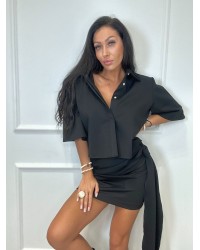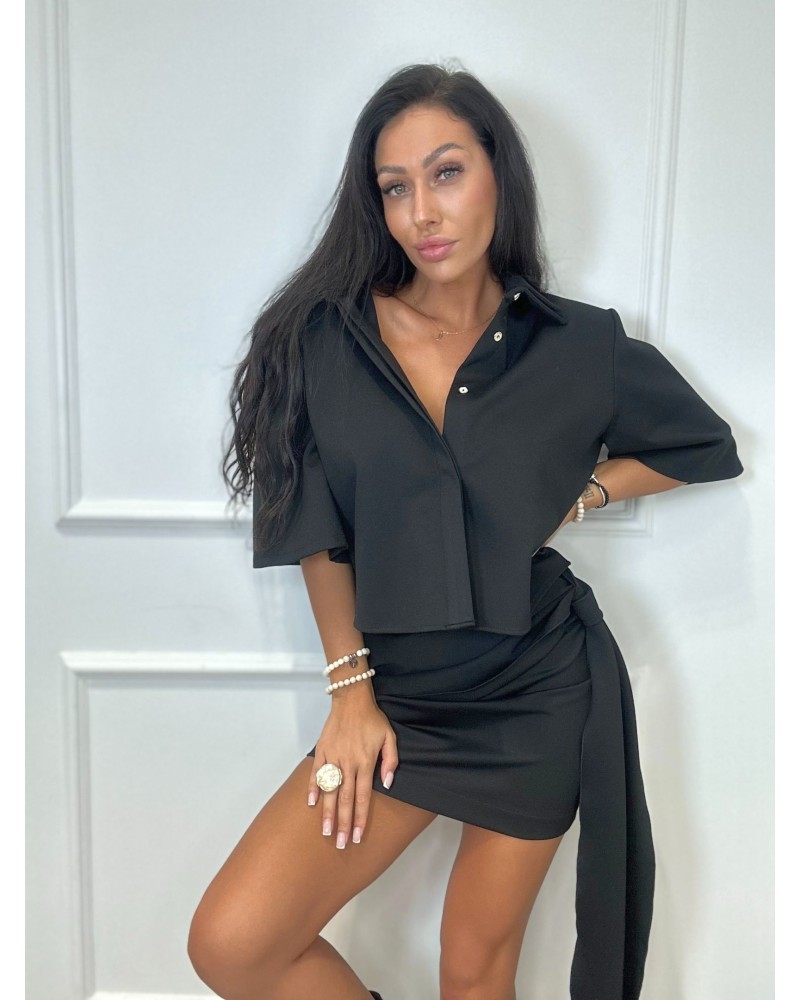 Stylowy komplet z koszulową górą i dopasowaną spódnicą z wiązaniem, idealny na eleganckie i nowoczesne stylizacje.