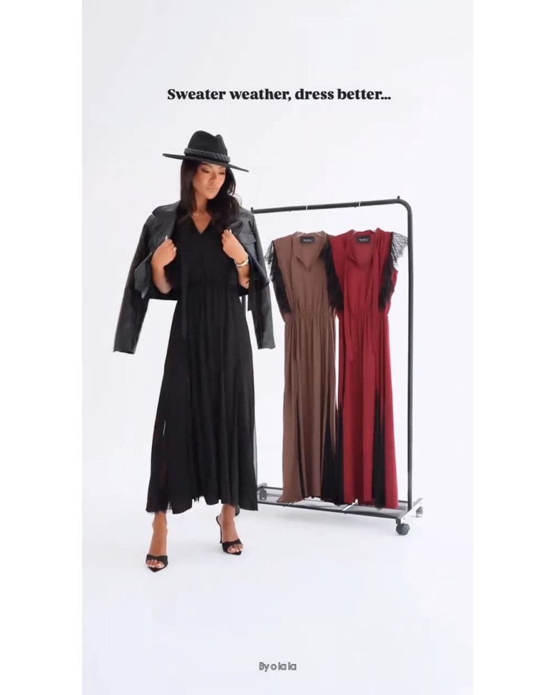 Wyjątkowa sukienka o długości maxi z dekoracyjnymi, koronkowymi rękawkami, które dodają całości subtelności i kobiecego uroku. Model posiada delikatny dekolt, marszczenie w pasie oraz pasek, który podkreśla talię i nadaje sylwetce lekkości. Lekki, zwiewny materiał pięknie układa się w ruchu, zapewniając komfort i swobodę. To doskonała propozycja na przyjęcia, uroczystości rodzinne, randki oraz inne eleganckie okazje. Dostępna w kilku wariantach kolorystycznych, co ułatwia dopasowanie do stylu i okazji.