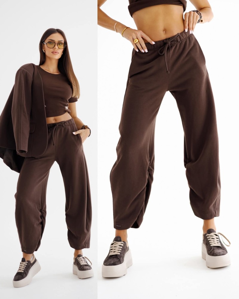 Dresowe spodnie z marszczoną nogawką to idealna propozycja dla kobiet ceniących sobie wygodę i modny wygląd. Wykonane z miękkiego, elastycznego materiału, zapewniają pełen komfort noszenia przez cały dzień. Luźny krój w połączeniu z lekko zwężanymi nogawkami i efektownym marszczeniem na dole dodaje stylizacji nowoczesnego charakteru. Ściągacz w pasie z wiązaniem pozwala dopasować spodnie do sylwetki, a boczne kieszenie zwiększają ich praktyczność. Doskonale sprawdzą się zarówno w codziennych, miejskich stylizacjach, jak i w bardziej sportowych zestawach. Połącz je z marynarką, crop topem i sneakersami, aby uzyskać modny, swobodny look.
