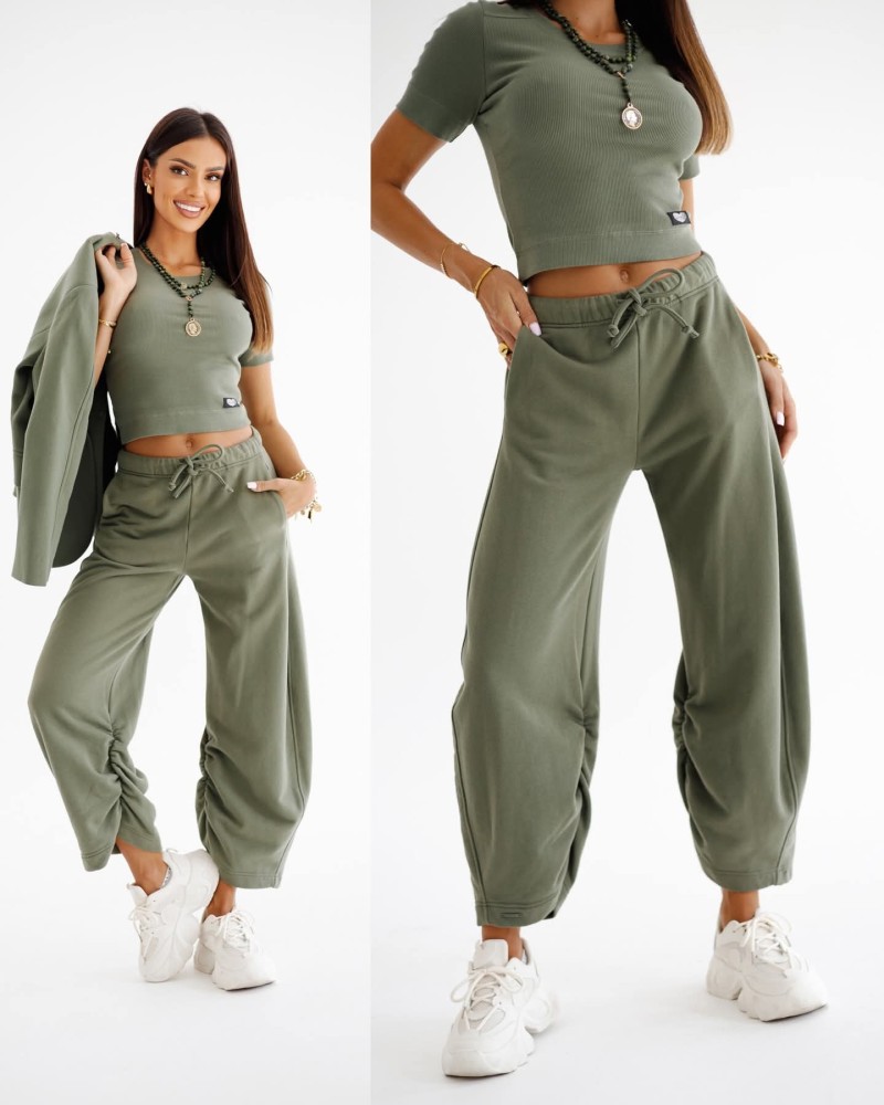 Dresowe spodnie z marszczoną nogawką to idealna propozycja dla kobiet ceniących sobie wygodę i modny wygląd. Wykonane z miękkiego, elastycznego materiału, zapewniają pełen komfort noszenia przez cały dzień. Luźny krój w połączeniu z lekko zwężanymi nogawkami i efektownym marszczeniem na dole dodaje stylizacji nowoczesnego charakteru. Ściągacz w pasie z wiązaniem pozwala dopasować spodnie do sylwetki, a boczne kieszenie zwiększają ich praktyczność. Doskonale sprawdzą się zarówno w codziennych, miejskich stylizacjach, jak i w bardziej sportowych zestawach. Połącz je z marynarką, crop topem i sneakersami, aby uzyskać modny, swobodny look.
