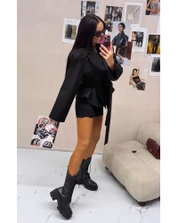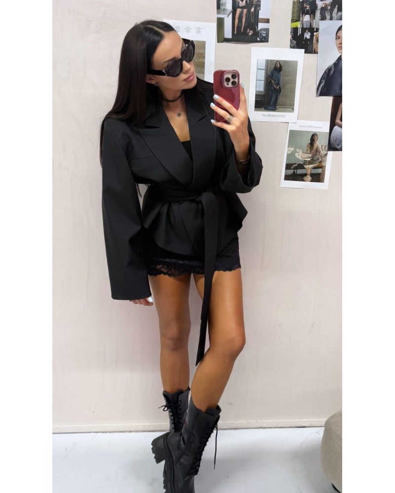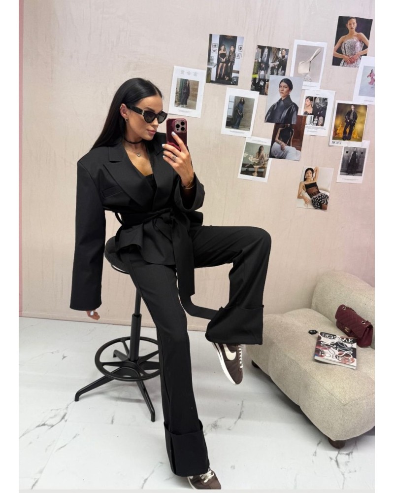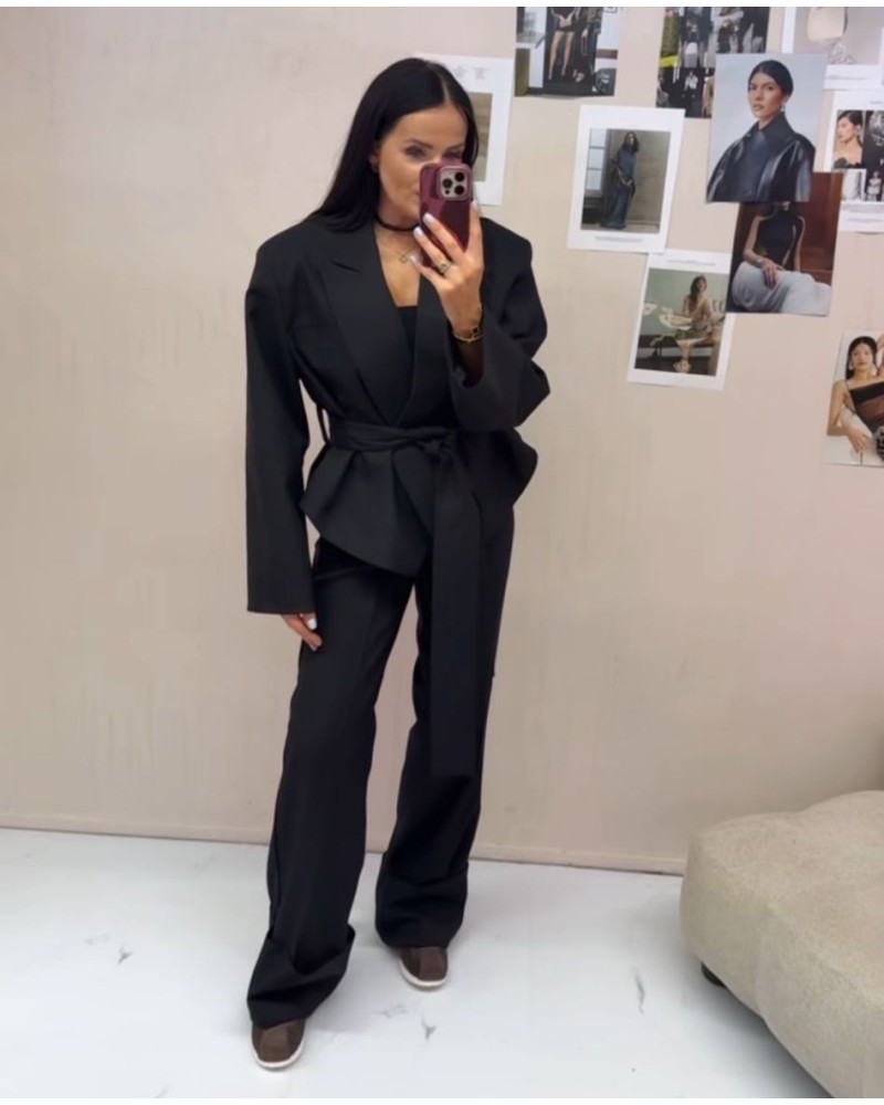 Ta marynarka to doskonałe połączenie klasyki z nowoczesnym designem. Model z wyrazistymi ramionami i głębokim dekoltem został uzupełniony o szeroki pasek, który pięknie podkreśla talię i nadaje stylizacji kobiecego charakteru. Lekko oversizowy fason zapewnia komfort noszenia, a wysokiej jakości tkanina prezentuje się elegancko zarówno w połączeniu z sukienką, jak i spodniami. To idealny wybór na randkę, spotkanie biznesowe lub wieczorne wyjście. Styl, który przyciąga spojrzenia!