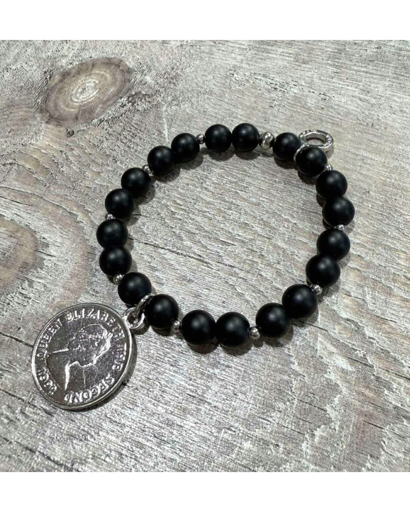 Bransoletka z czarnego kamienia wulkanicznego, ozdobiona srebrną monetą. Surowa elegancja i moc natury w jednym, niepowtarzalnym dodatku.