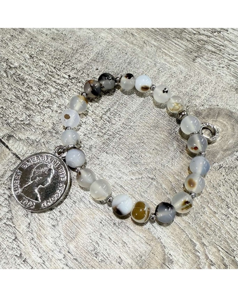 Bransoletka z naturalnego agatu dendrytowego, ozdobiona srebrną monetą. Subtelność natury i klasyczny detal.
