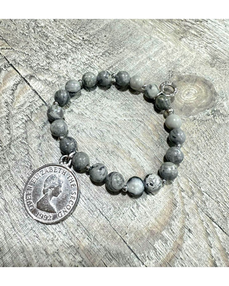 Bransoletka z naturalnego szarego jaspisu, ozdobiona srebrną monetą. Minimalizm i harmonia zamknięte w kamieniu o wyjątkowym rysunku natury.