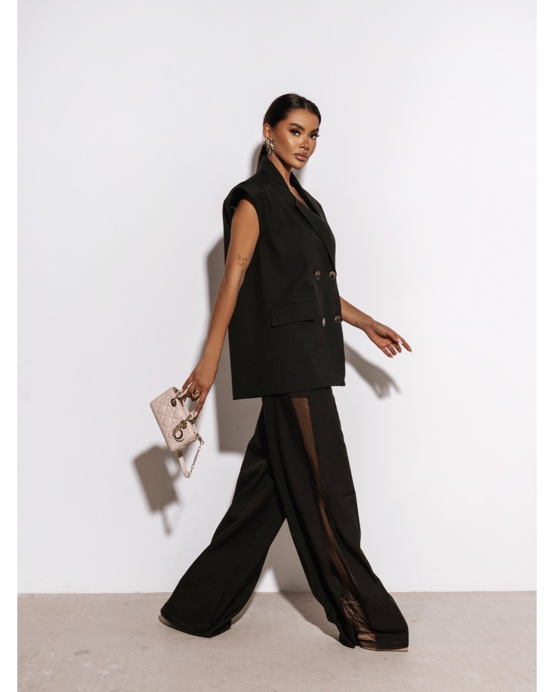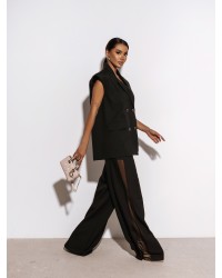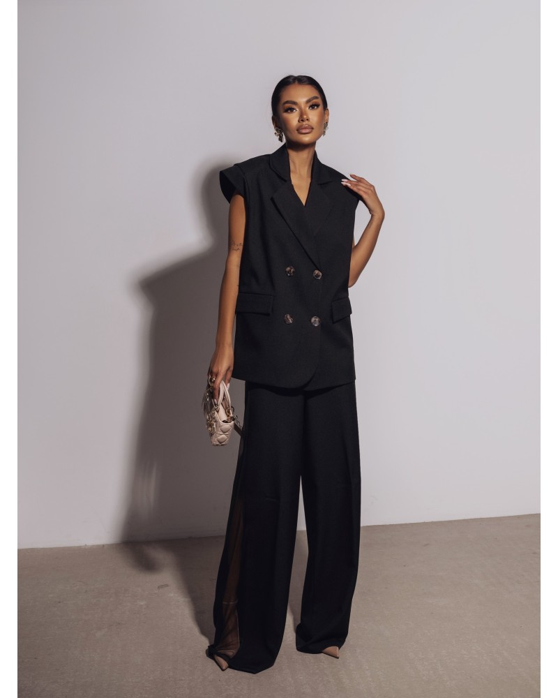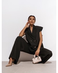 Oversize’owa kamizelka garniturowa o modnym, dwurzędowym kroju z szerokimi ramionami i klasycznym kołnierzem. Model z klapami oraz ozdobnymi guzikami nadaje stylizacji eleganckiego charakteru, zachowując przy tym swobodny, nowoczesny look. Kamizelka posiada wszyte kieszenie z patkami i jest wykonana z materiału o gładkiej strukturze, który dobrze układa się na sylwetce. Idealna jako baza do stylizacji smart casual – świetnie prezentuje się w zestawieniu z szortami, spodniami z wysokim stanem lub dopasowaną sukienką.