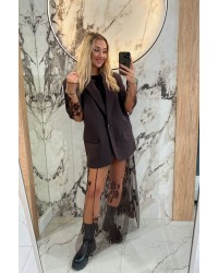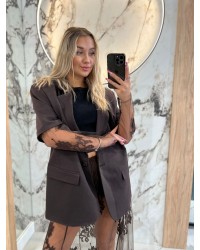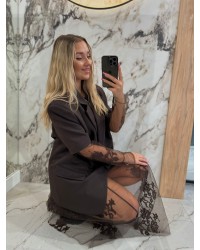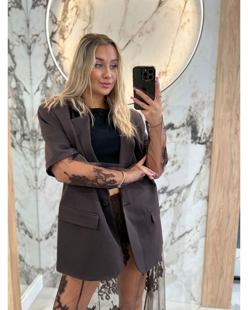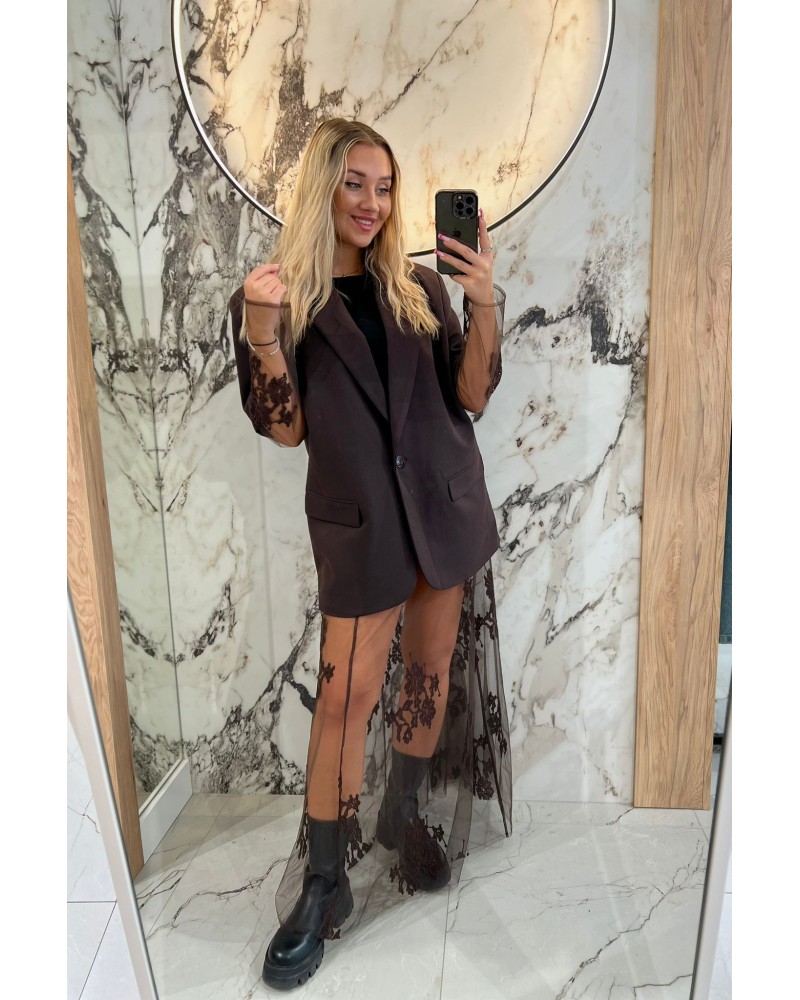 Wyjątkowa marynarka o klasycznym kroju, wzbogacona o oryginalne rękawy z tiulową, haftowaną wstawką. Model z kołnierzem z klapami, zapinany na jeden guzik, posiada wsuwane kieszenie z patkami i gładką podszewkę. Krótkie rękawy z przezroczystym detalem nadają całości lekkości i wyrafinowanego charakteru. To idealna propozycja dla kobiet, które chcą wyróżnić się elegancją z nutą nowoczesności. Doskonale sprawdzi się w stylizacjach wieczorowych, biznesowych i na specjalne okazje.
