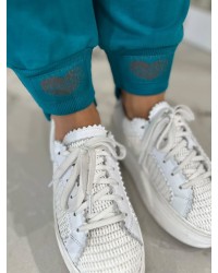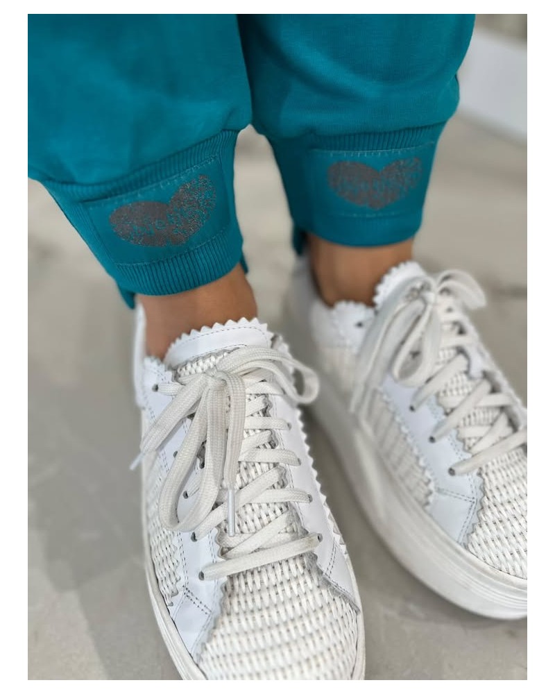 Wygodne spodnie dresowe z ozdobnym haftem serduszka na nogawce. Idealne na co dzień i do stylizacji casualowych.