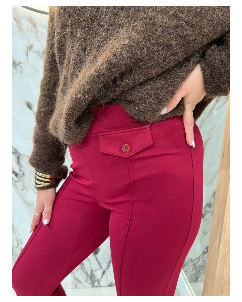 Eleganckie legginsy z lekko rozszerzaną nogawką, ozdobną zakładką i guzikiem. Idealne do stylizacji biurowych i casualowych.