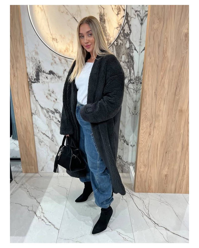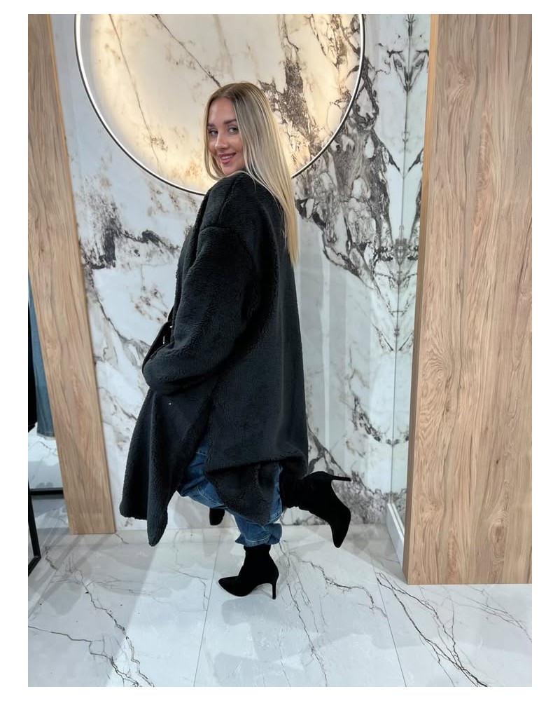 Miękki, długi płaszcz typu teddy z prostym fasonem i przyjemnym w dotyku materiałem. Must-have na chłodne dni.