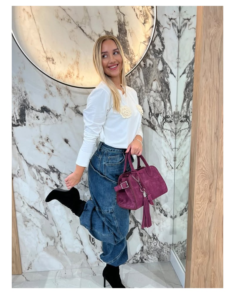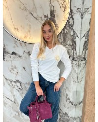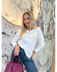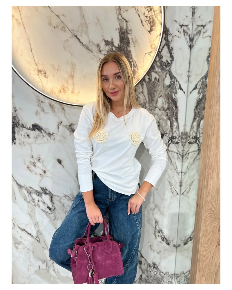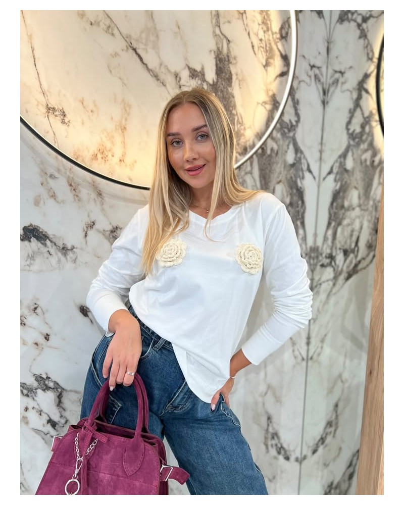 Bluzka z długim rękawem ozdobiona efektownymi kwiatowymi aplikacjami z przodu. Idealna propozycja na co dzień i na specjalne okazje.
