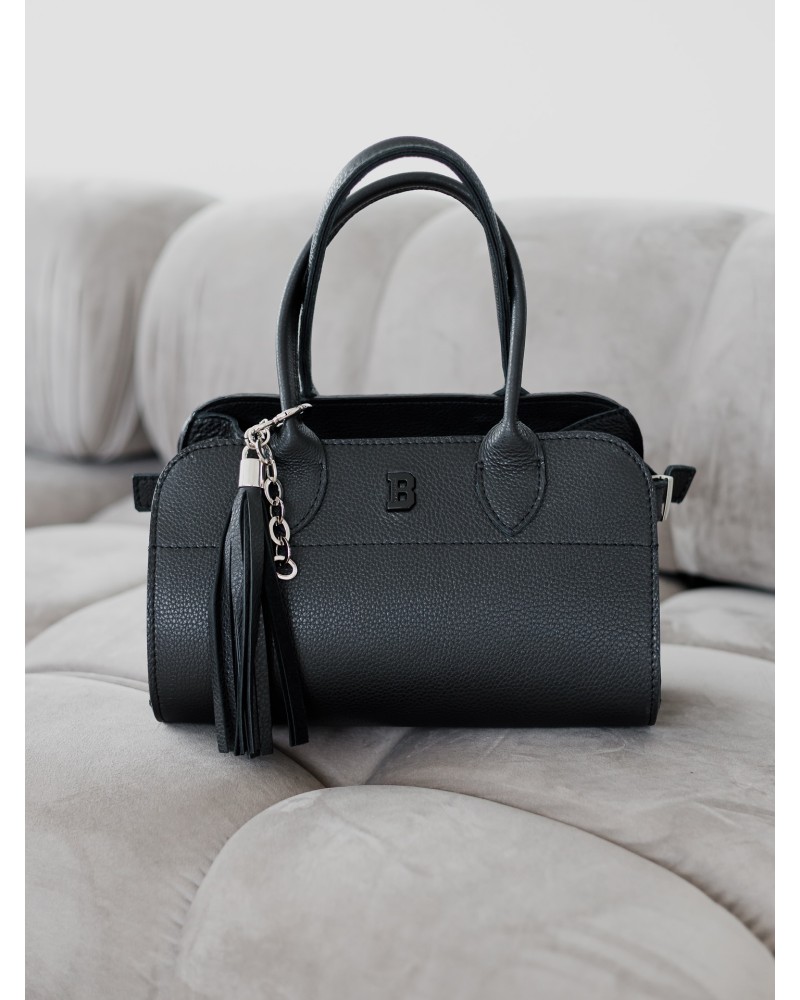 Stylowa torebka o usztywnianej formie, która łączy funkcjonalność z elegancją. Posiada wygodne, podwójne uchwyty do noszenia w ręce oraz ozdobny brelok z frędzlami i łańcuszkiem, który dodaje całości charakteru. Model zapinany na zamek, z przestronnym wnętrzem idealnym na najpotrzebniejsze rzeczy – portfel, telefon, kosmetyki i inne drobiazgi. Doskonale sprawdzi się jako uzupełnienie codziennych oraz bardziej formalnych stylizacji. Ponadczasowy fason, który nie wychodzi z mody.